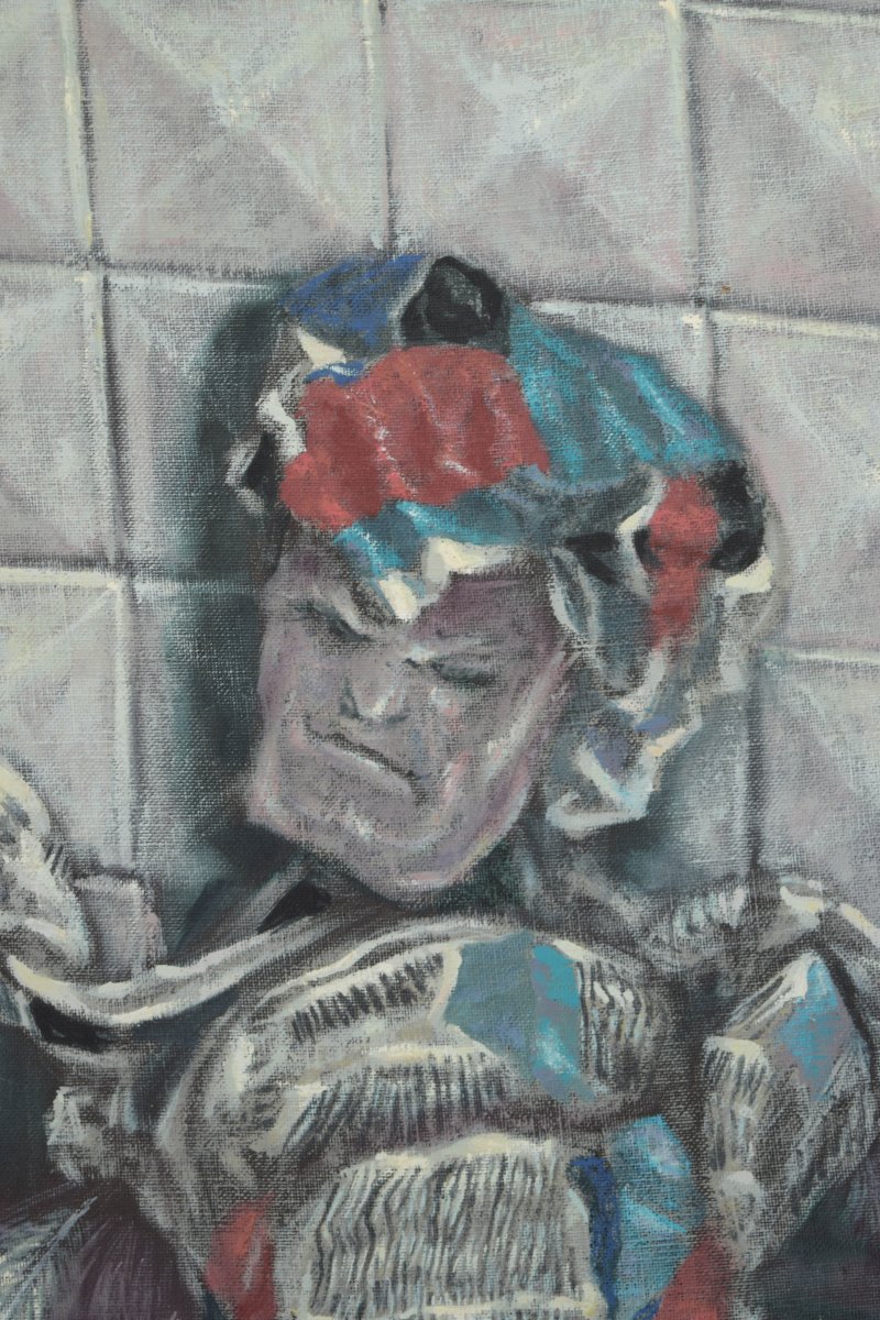 Il dipinto raffigura un angelo fantoccio svenuto per i soprusi e le violenze subiti nel laboratorio del medico nazista Mengele.