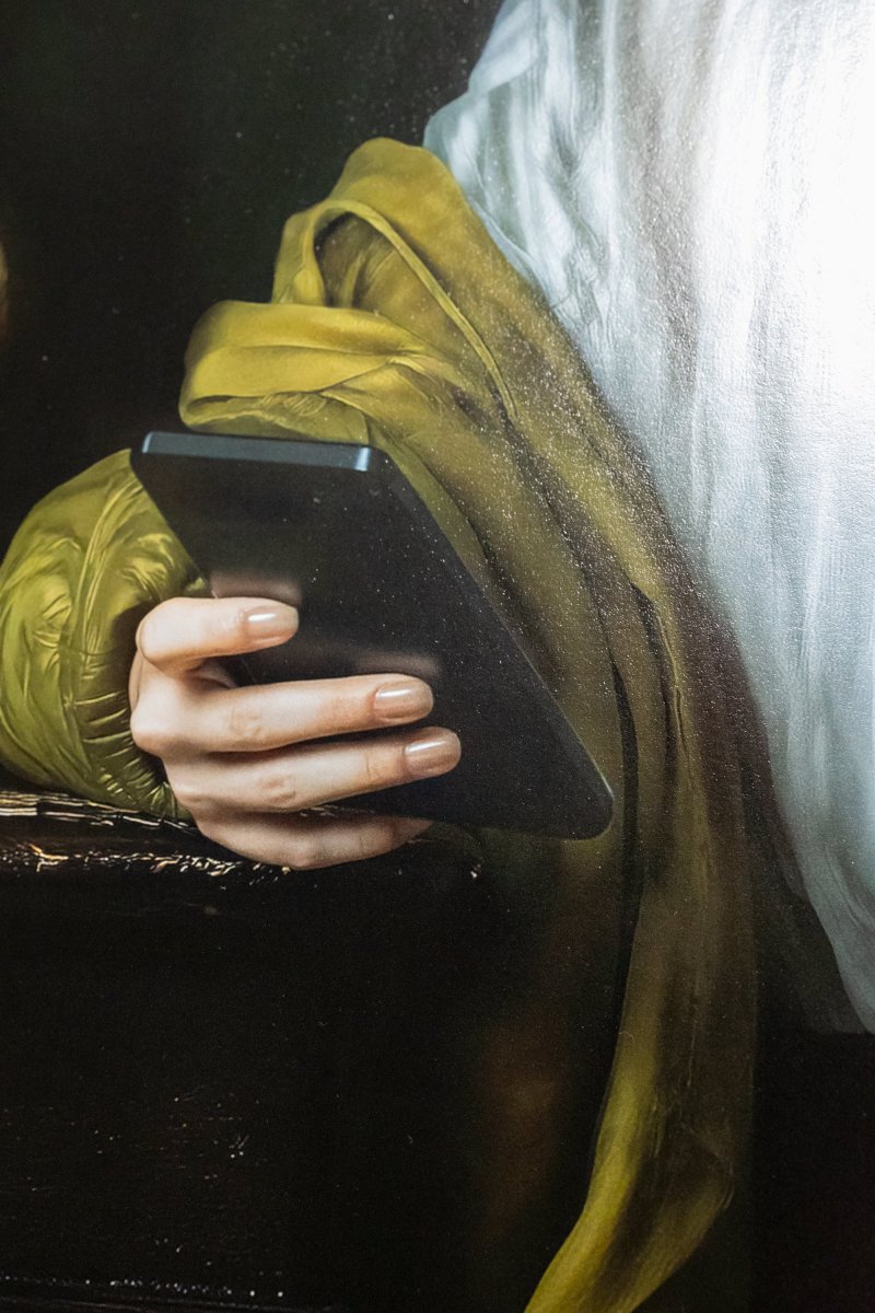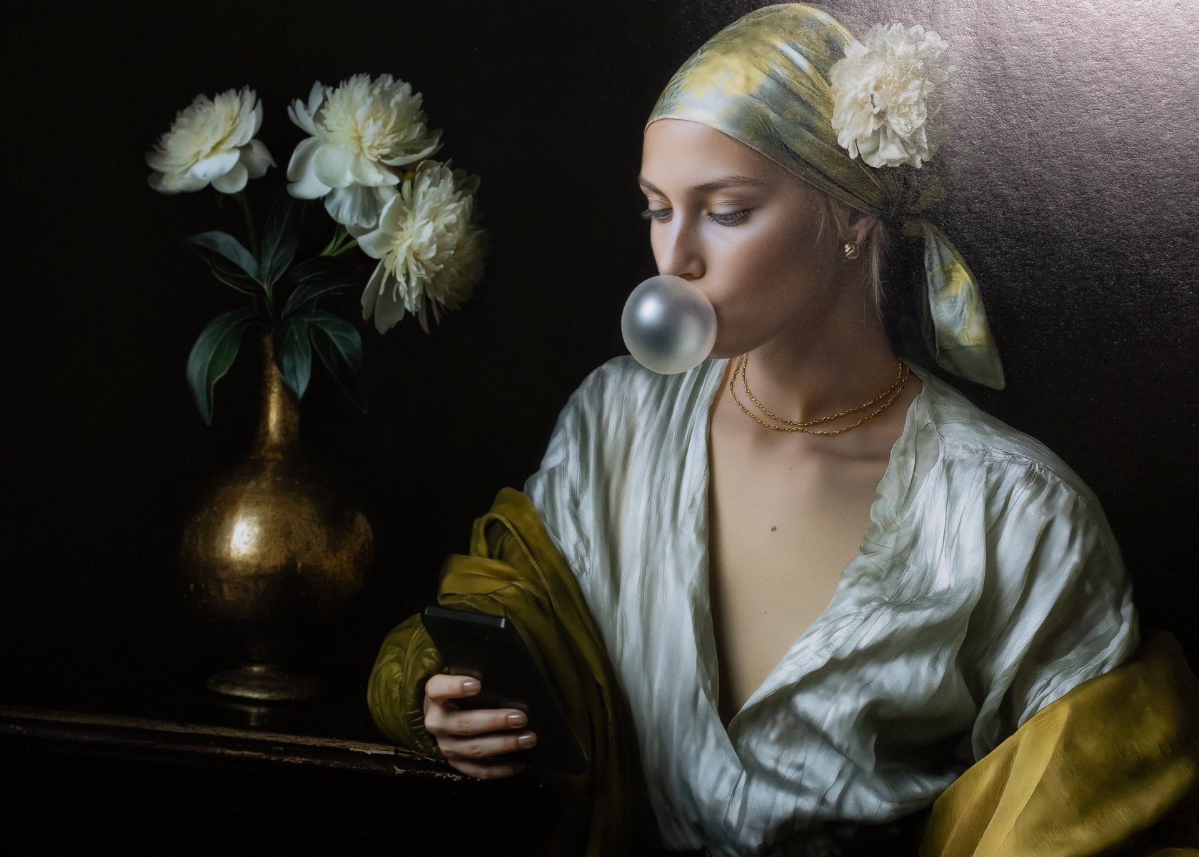 Styled in the visual language of Dutch Golden Age painting, “Scrolling Time” reflects on 21st-century digital rituals. It captures our modern trance: where we once meditated over a flower, we now "chew" through news, inflating information like bubbles while sinking into the oblivion of the infinite feed.