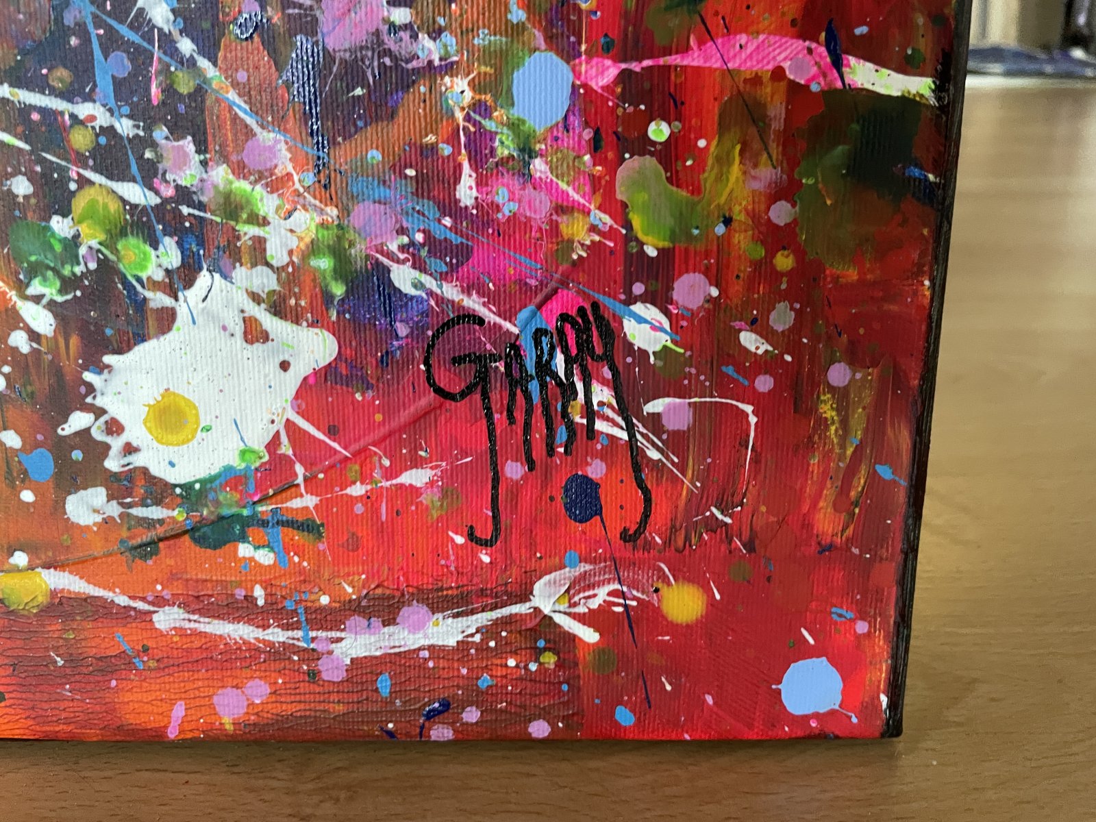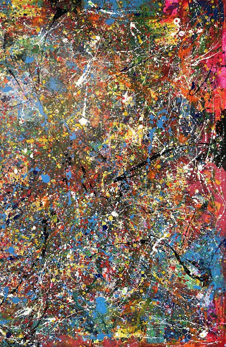 The second canvas, inspired by Sam Smith, retains the gestural essence but with a more structured approach within the apparent disorder. Here, luminous and circular colors intertwine with vibrant tones and bold black strokes, creating an effect of almost three-dimensional depth. While the first canvas expresses