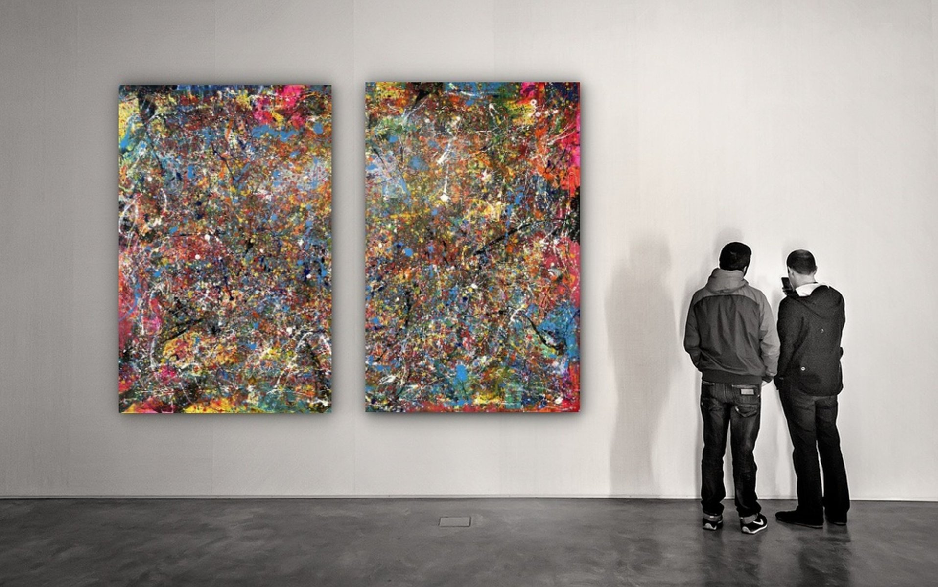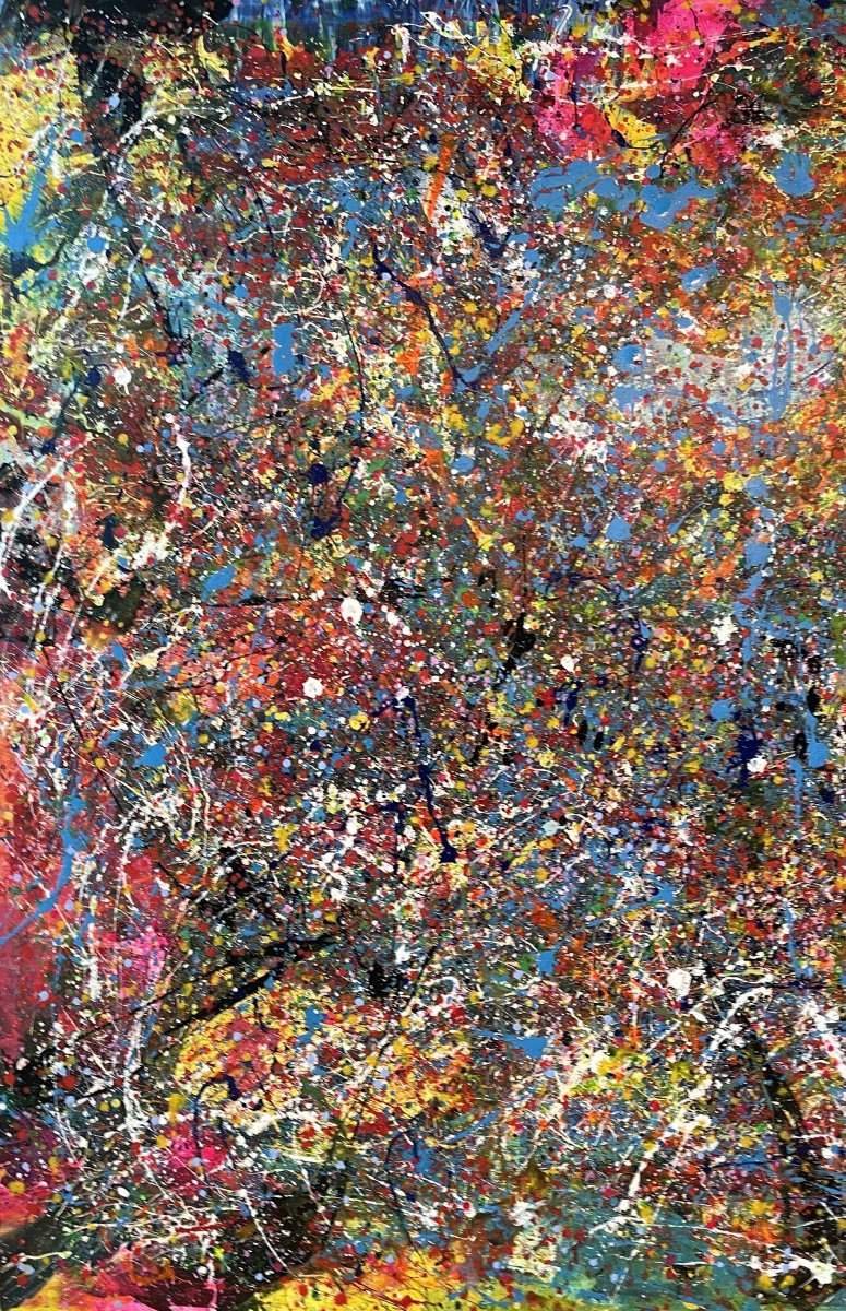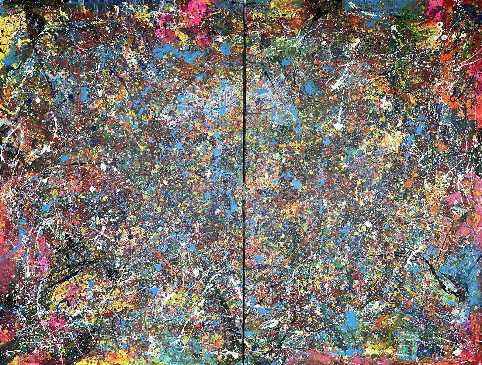 This abstract work consists of a diptych in which the action painting technique unfolds with overwhelming energy. The first canvas clearly reflects the influence of Jackson Pollock: a tangle of dynamic lines, splashes, and drips of acrylic and oil paint dance across the surface in a composition that is both chaotic and harmonious. Dark tones such as black and deep blue contrast with bursts of white and carmine red, suggesting a constant struggle of forces in motion.