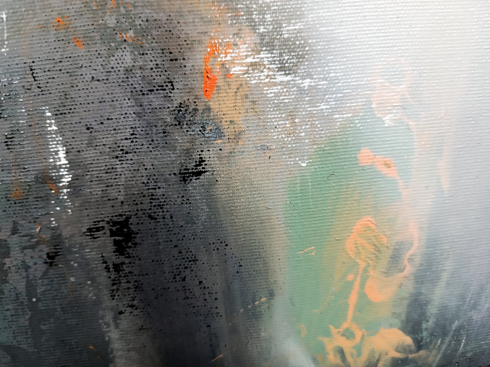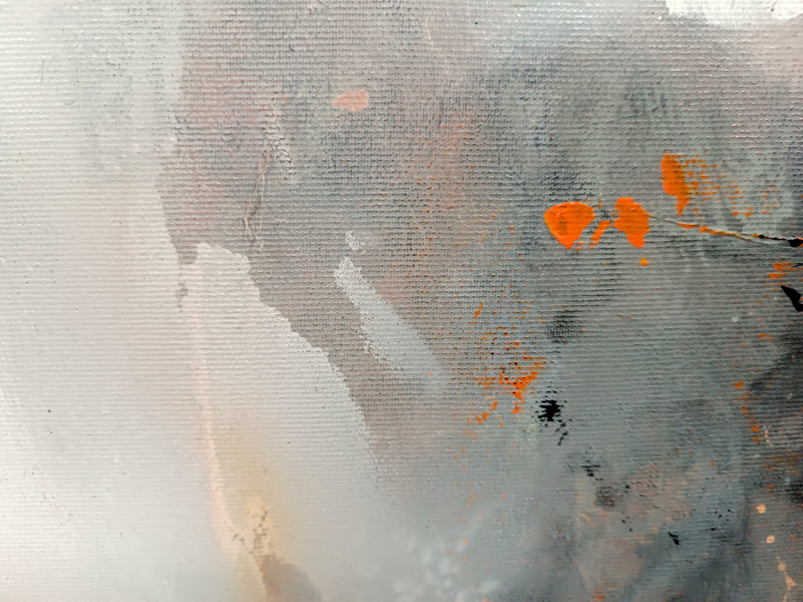 Subtle ruptures of ember and ochre punctuate the field — chromatic fissures that interrupt the monochrome hush. These are not decorative gestures; they function as energetic disclosures. Within contemporary abstraction, such restrained chromatic interruptions operate as sites of tension — where gesture meets atmosphere, where material presence negotiates with interior resonance.