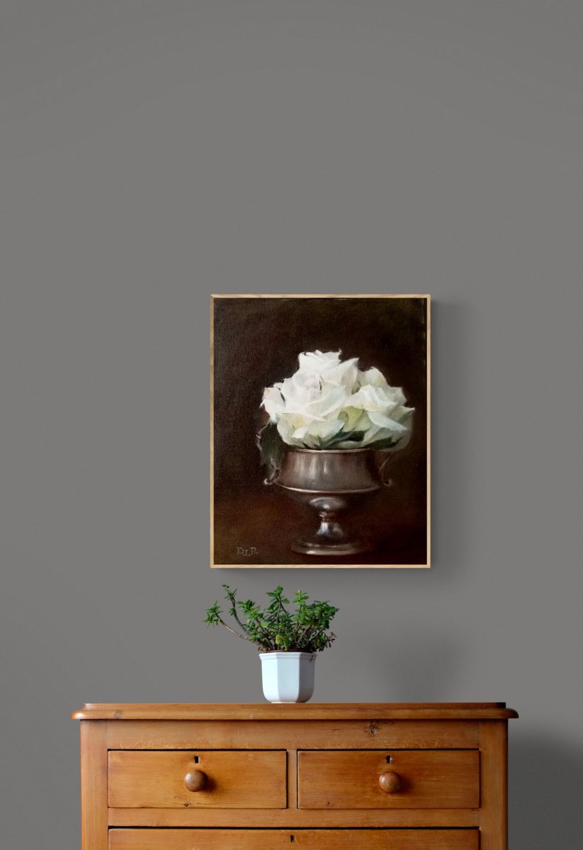 This is an oil painting of a small bouquet of white roses arranged in a small silver vase.