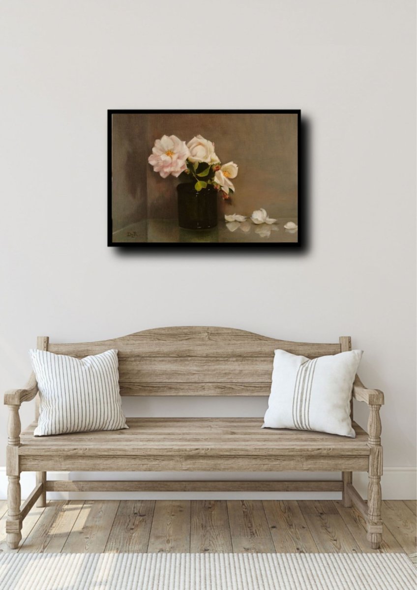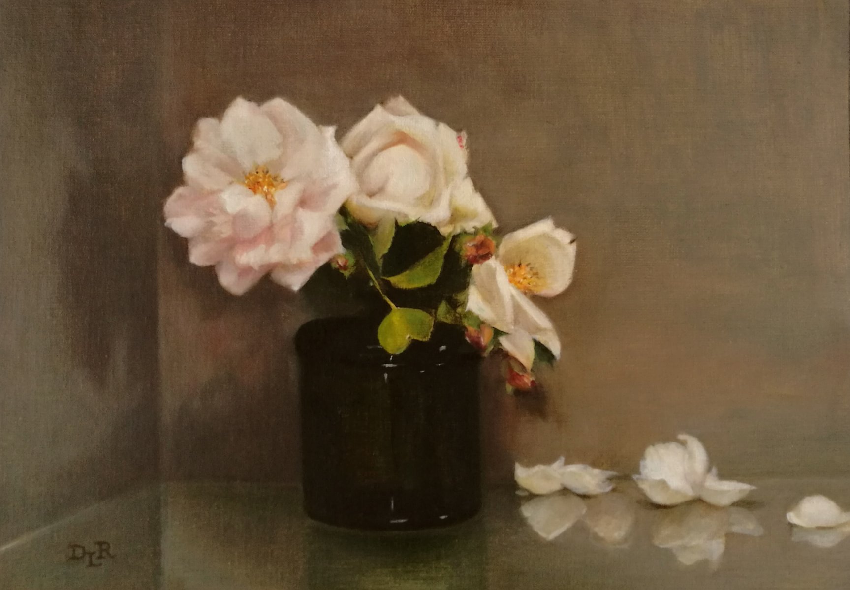 This is an oil painting of a small bouquet of garden roses. Painting roses from life is a treat. Not only because I get to spend some time observing and taking in their beauty for a few moments, inhaling their delicate fragrance, but also makes me think about how fleeting their beauty is. It's an act of meditation and a constant reminder that life is short and time is precious.