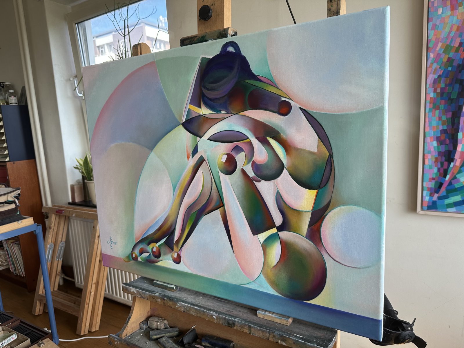 It all began with my graphite pencil drawing ‘Roundism – 05-07-16’ which I sold very quickly after its completion. For years I had this on my to do list of oils yet to start. I always thought of it to be a great cubist concept. Successfully merging cubistic body parts I knew this also held the potential of a grand painting. Somehow I had this concept of matching this mergance to the use of colours as well. Almost as if one would look at a display of mother of pearl-like colors. As stated above, a tall order and a big Gordian Knot. This time not one Alexander The Great would solve by simply cutting through it. Soon I found myself in big trouble because all colours were screaming at me in full force. both in the positive and the negative space.