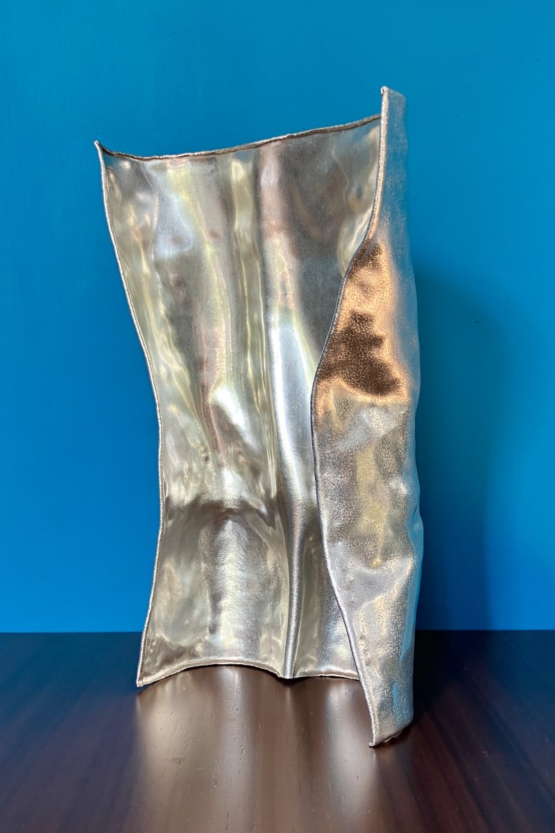 The sculpture is formed from a 24x24 square tin sheet, mostly using hands with the help of wooden tools, the signature chop is made out of paper clay.