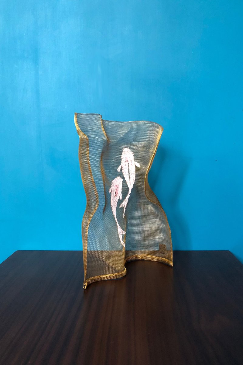 The koi are embroidered with white treads onto the copper wire mesh torso, then acrylic colours are applied to the embroidery