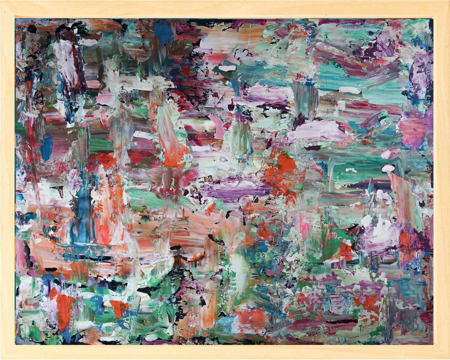 Acrylic, oil paint and pastels on preprocessed wooden panel in wooden frame.