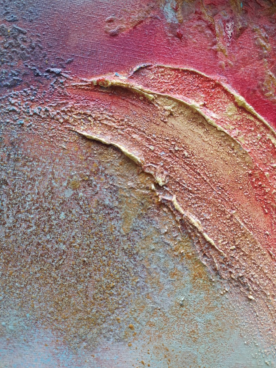 Amrutha (elixer of life), is a painting with lots of effects caused by the interaction of water with paint and different paint media. All kinds of tiny structures were formed this way. At the beginning the colours of the entire painting were brown and red. I then decided to add this beautiful, bright blue which then elevated it to a new level.