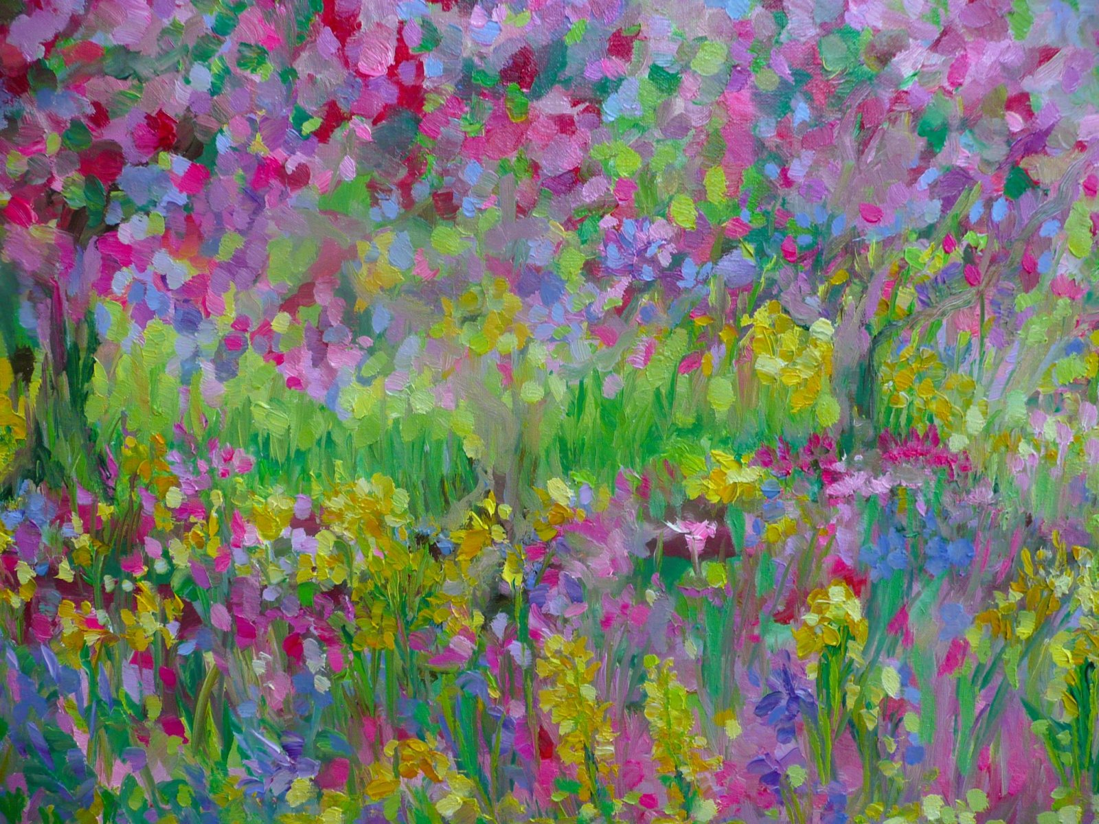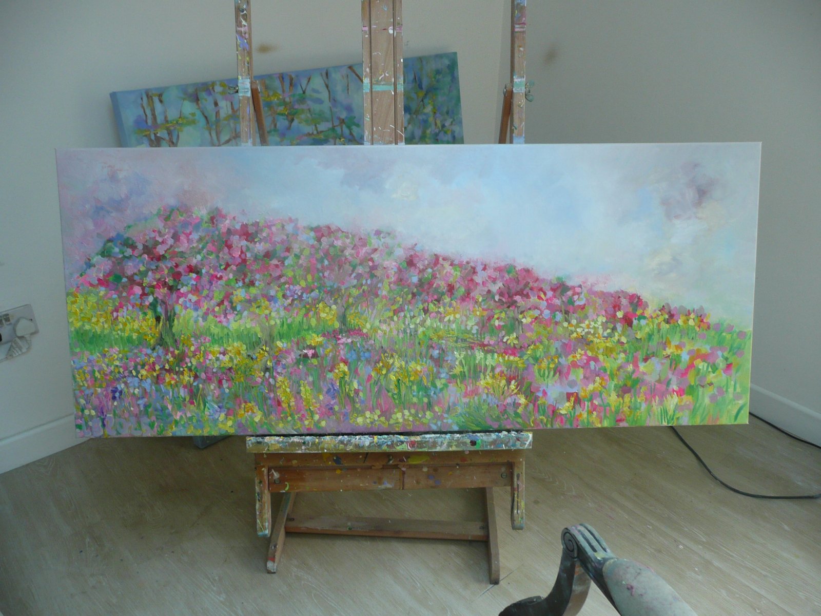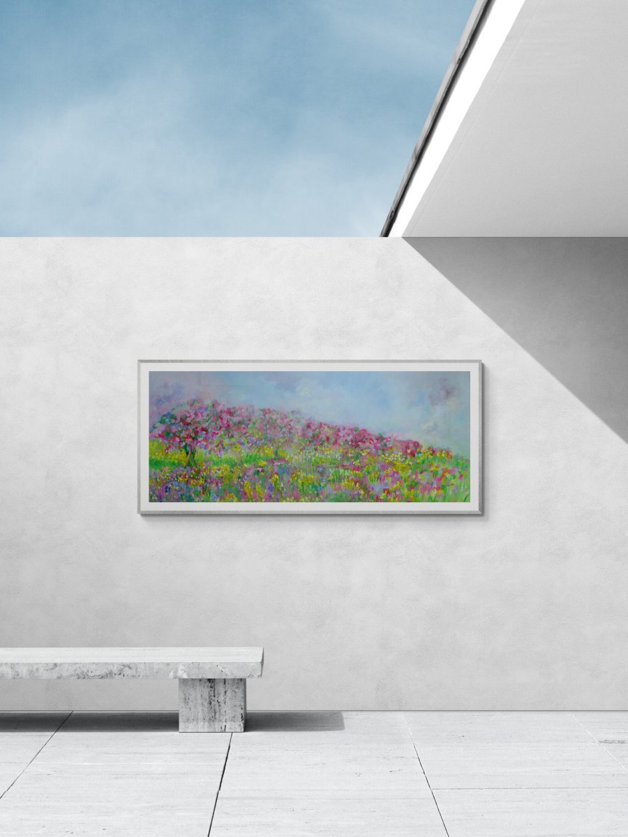 impressionistic oil painting on deep boxed linen canvas a panoramic painting of cherry blossom in a landscape setting