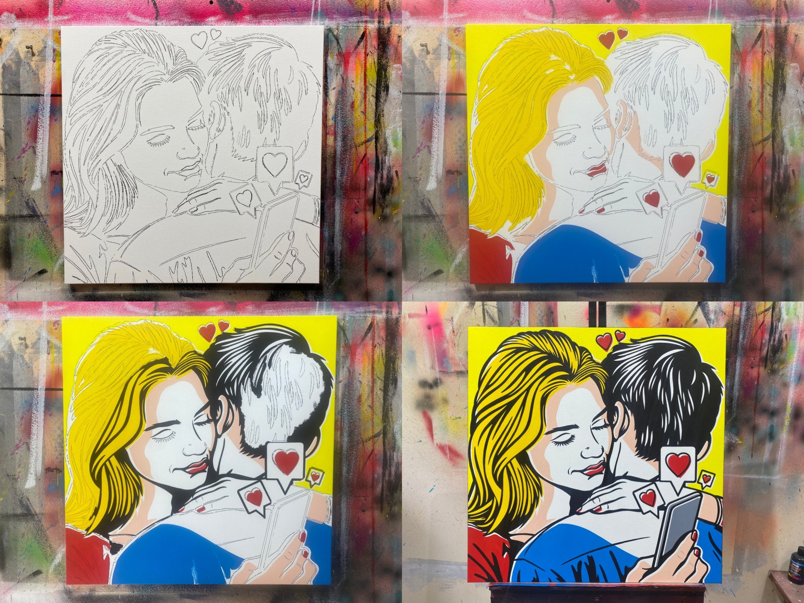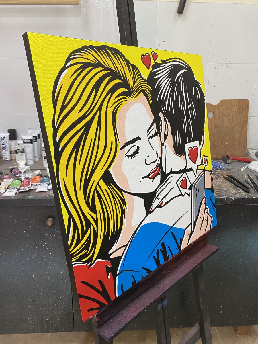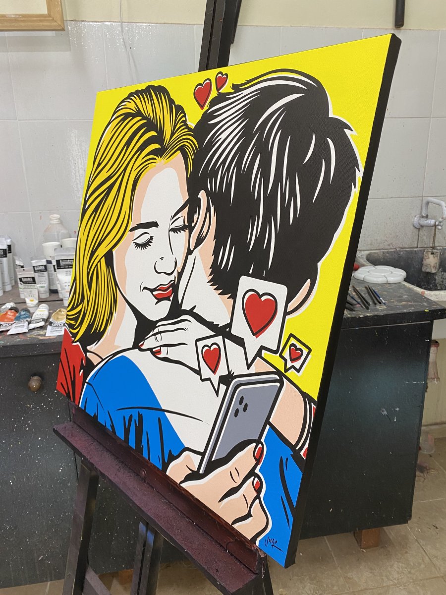 A young couple embrace, he loves her, shes more interested in the attention shes getting from others on social media. In creating this acrylic painting, I channeled the vibrant energy of comic and pop art styles to explore modern love and its complexities. The glaring contrast between the warm, seemingly intimate embrace and the distraction of technology speaks volumes about today’s digitalized relationships. This piece vividly captures the irony of close yet distant connections, aiming to stir introspection and conversation in your space about the nature of love in our digital era. Painted in acrylics in a style representing offset printing, the misaligned print layers are a representation of how the protagonists lives are slightly out of line.