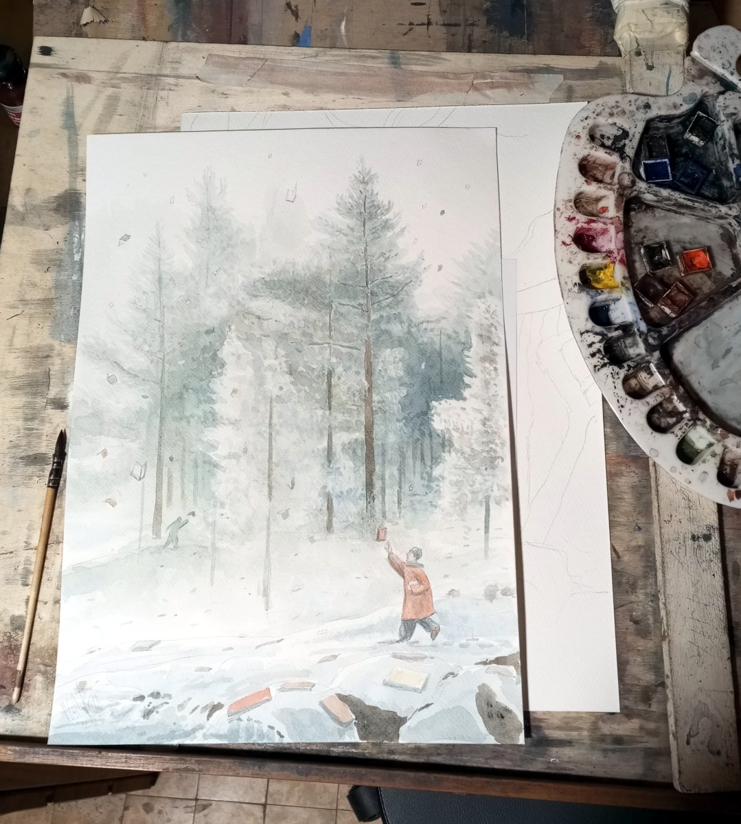 Men catching books falling from the sky in a snowy landscape with trees - Watercolour and pastel on paper cm 42x29,7