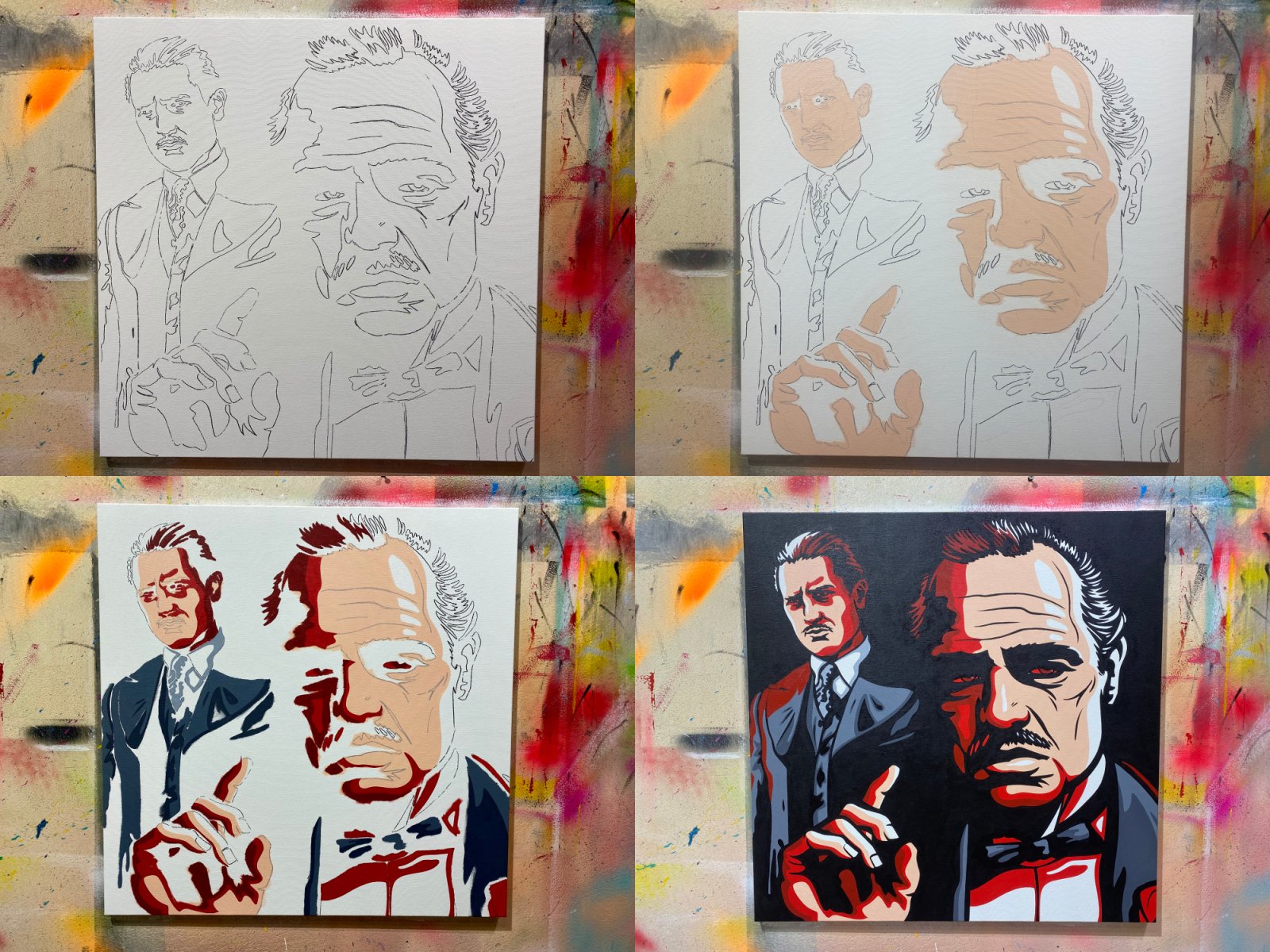 Pop art painting of Don Vito Corleone at two stages of his life. A young Vito played by Robert DeNiro and the older Vito played by Marlon Brando in their iconic roles in The Godfather Movies. Comic book style painting.