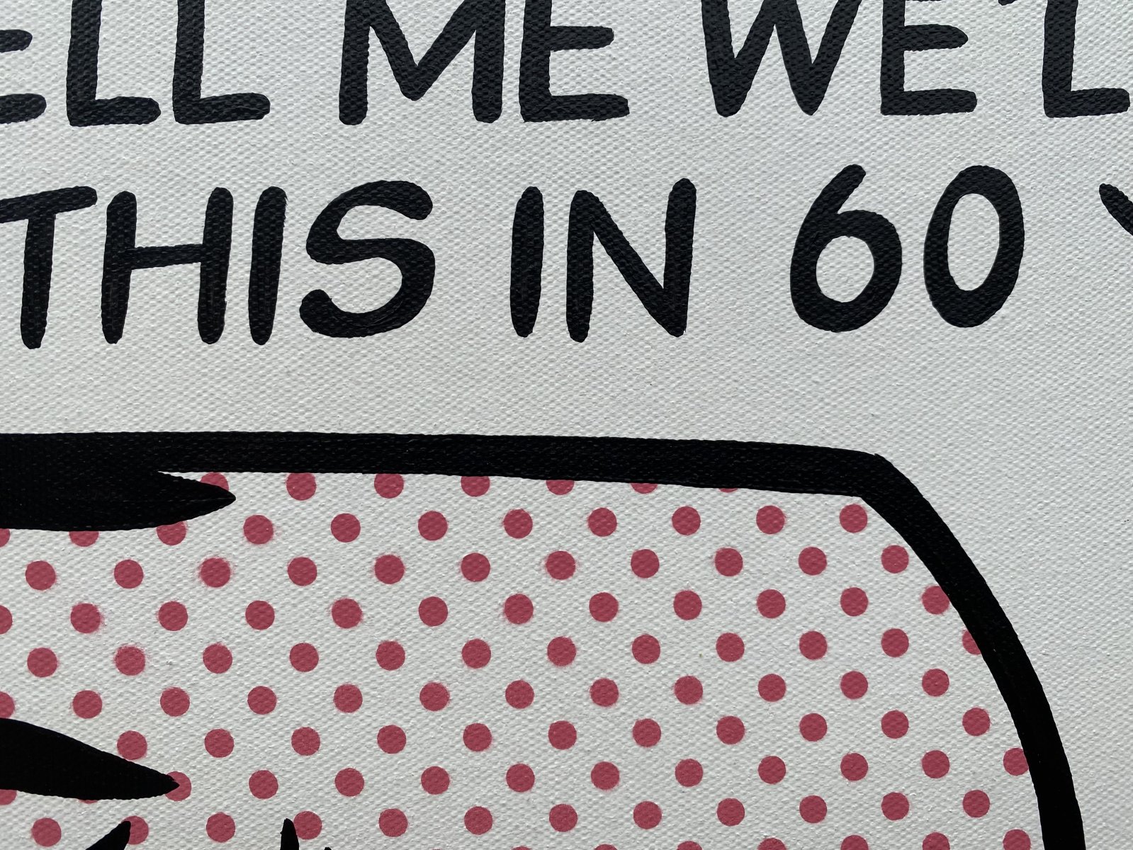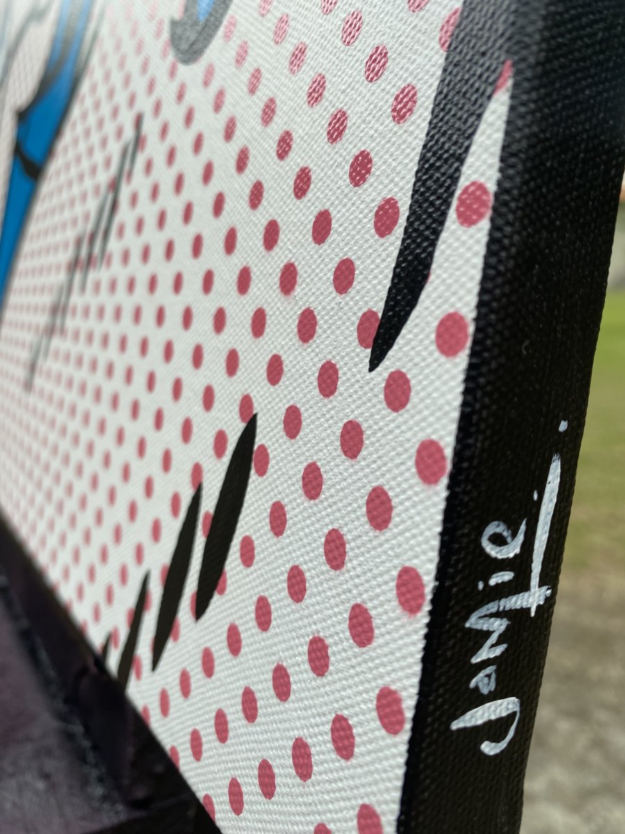 Professional quality acrylics and spray paint for the stencilled benday dots, on stretched canvas. The painting is signed on the side and the back of the canvas by the artist. The sides are painted black ready to hang direct, or frame. This painting comes with a signed certificate of authenticity.