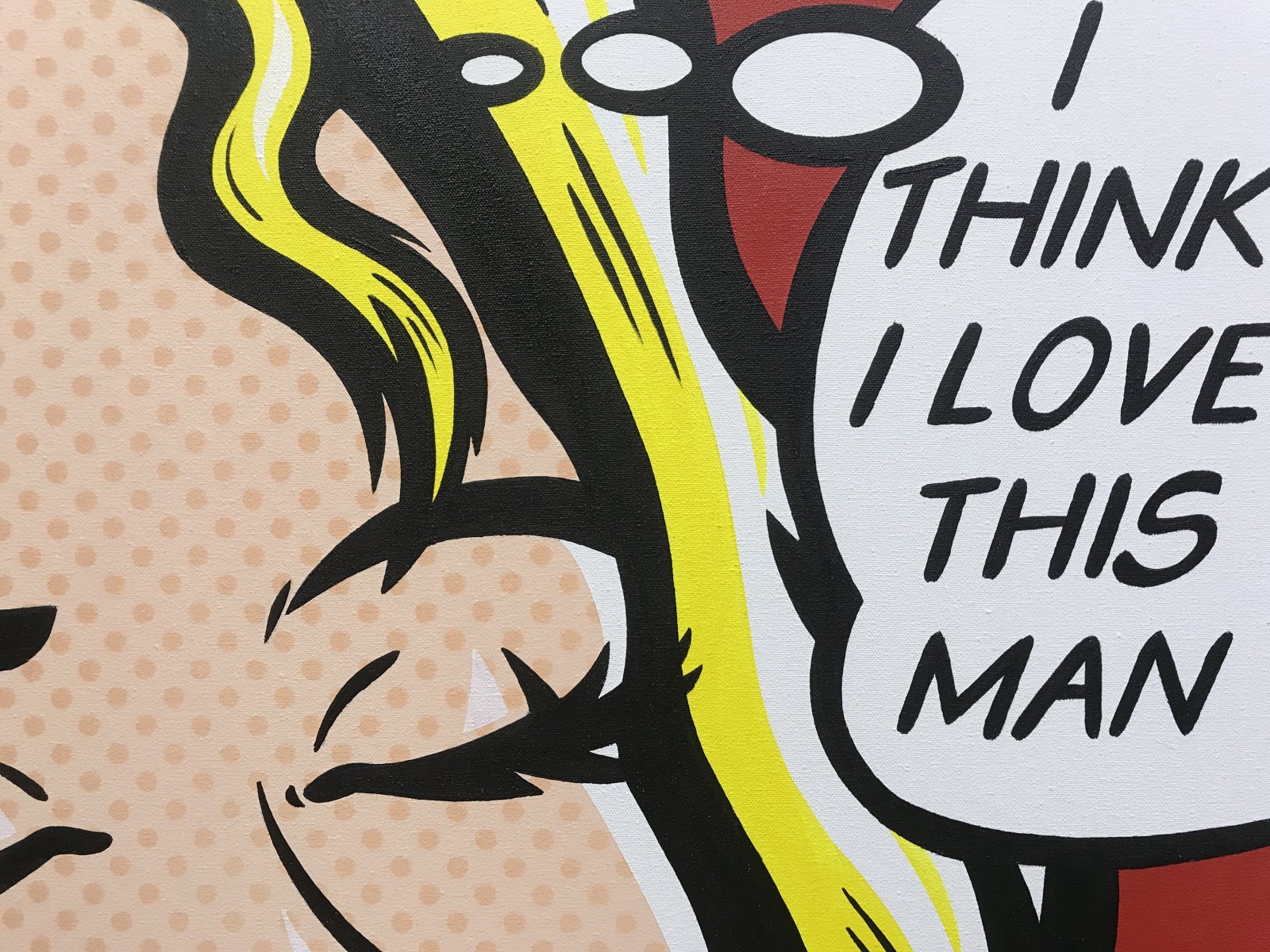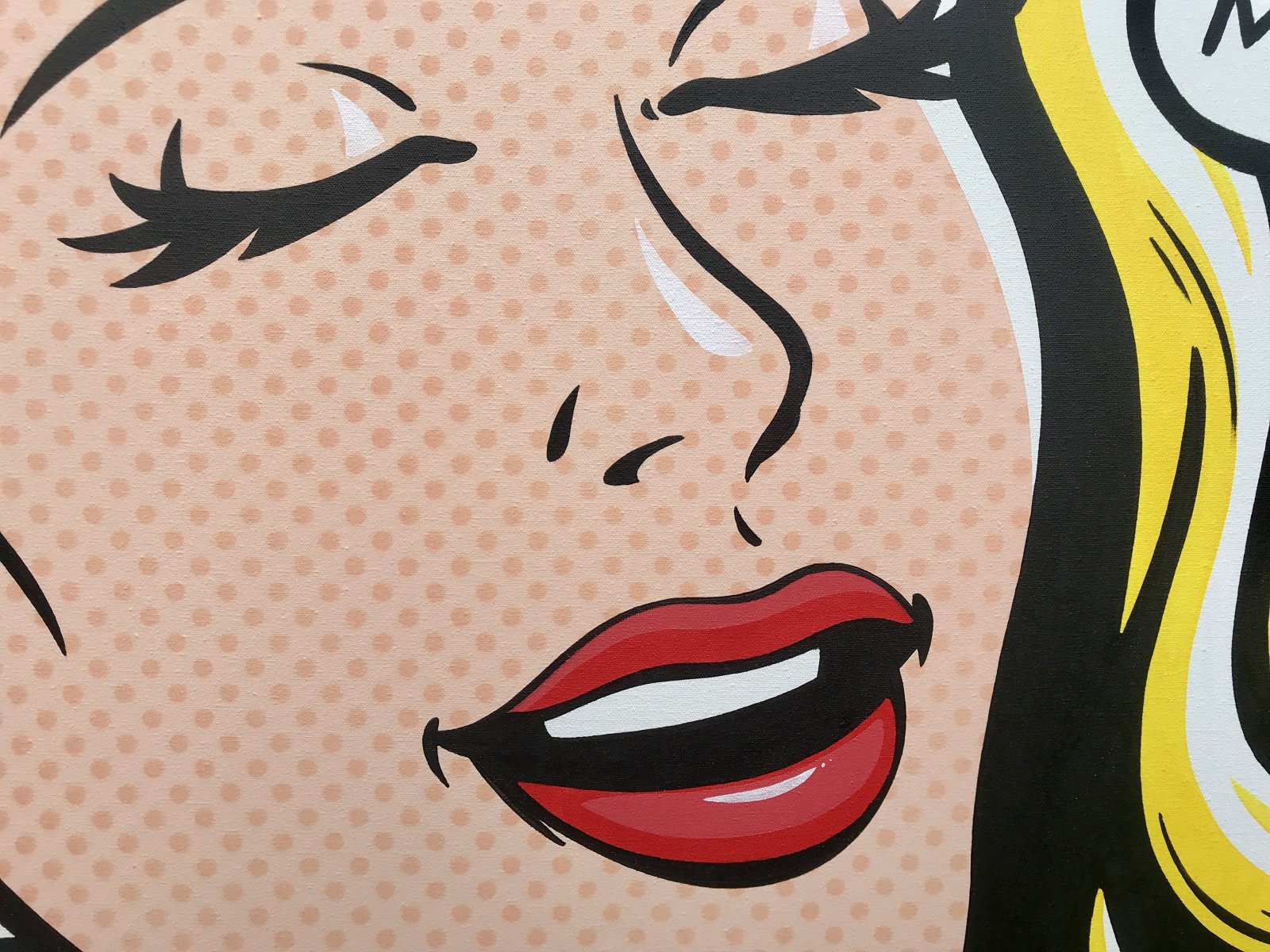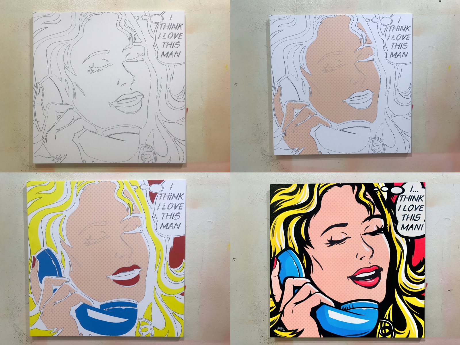 Original design comic book style hand painted pop art. A pretty young woman talking on an old retro phone, realises shes in love with the man shes talking to.