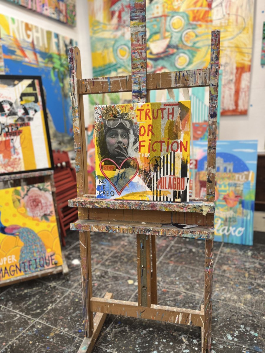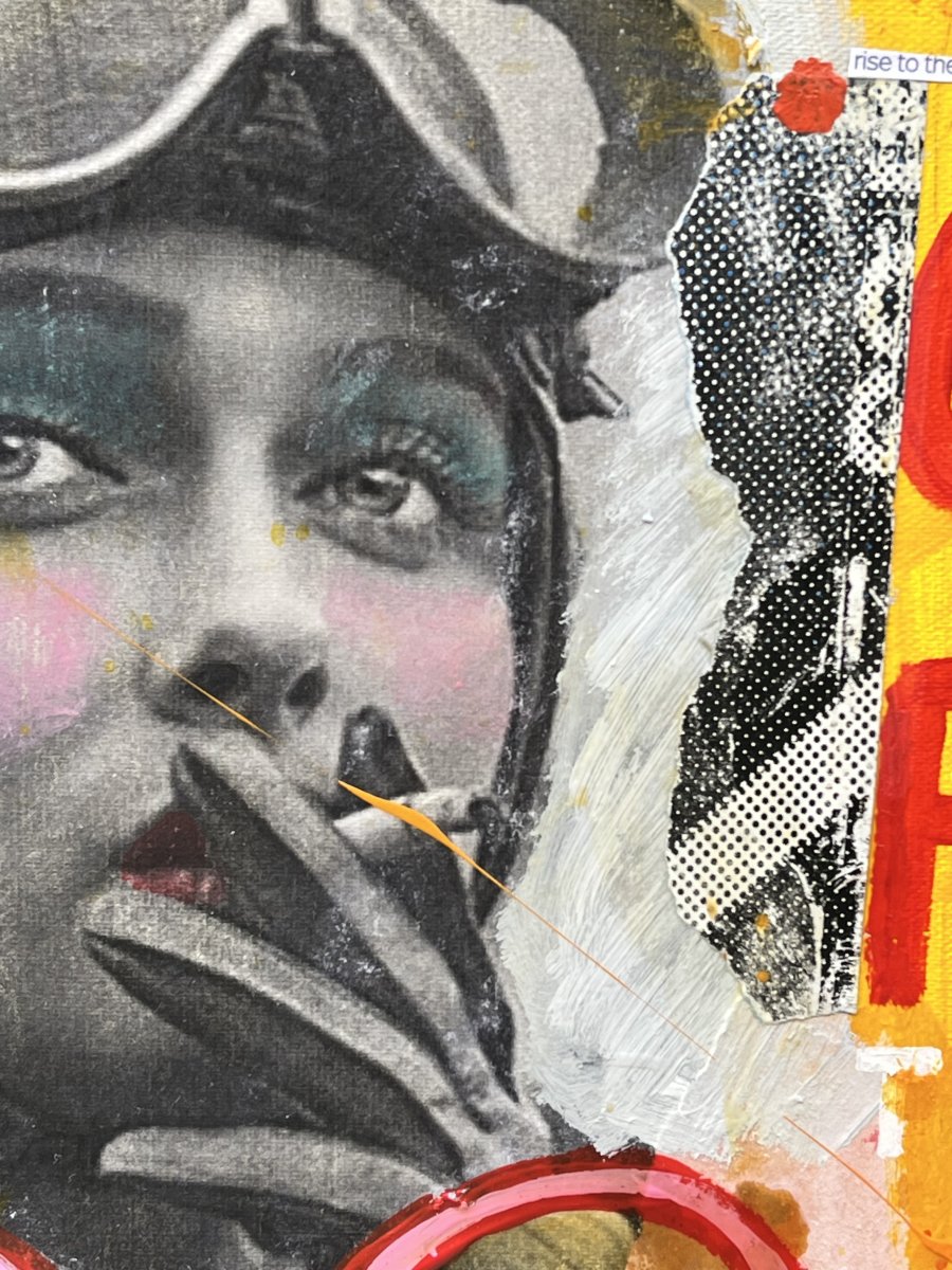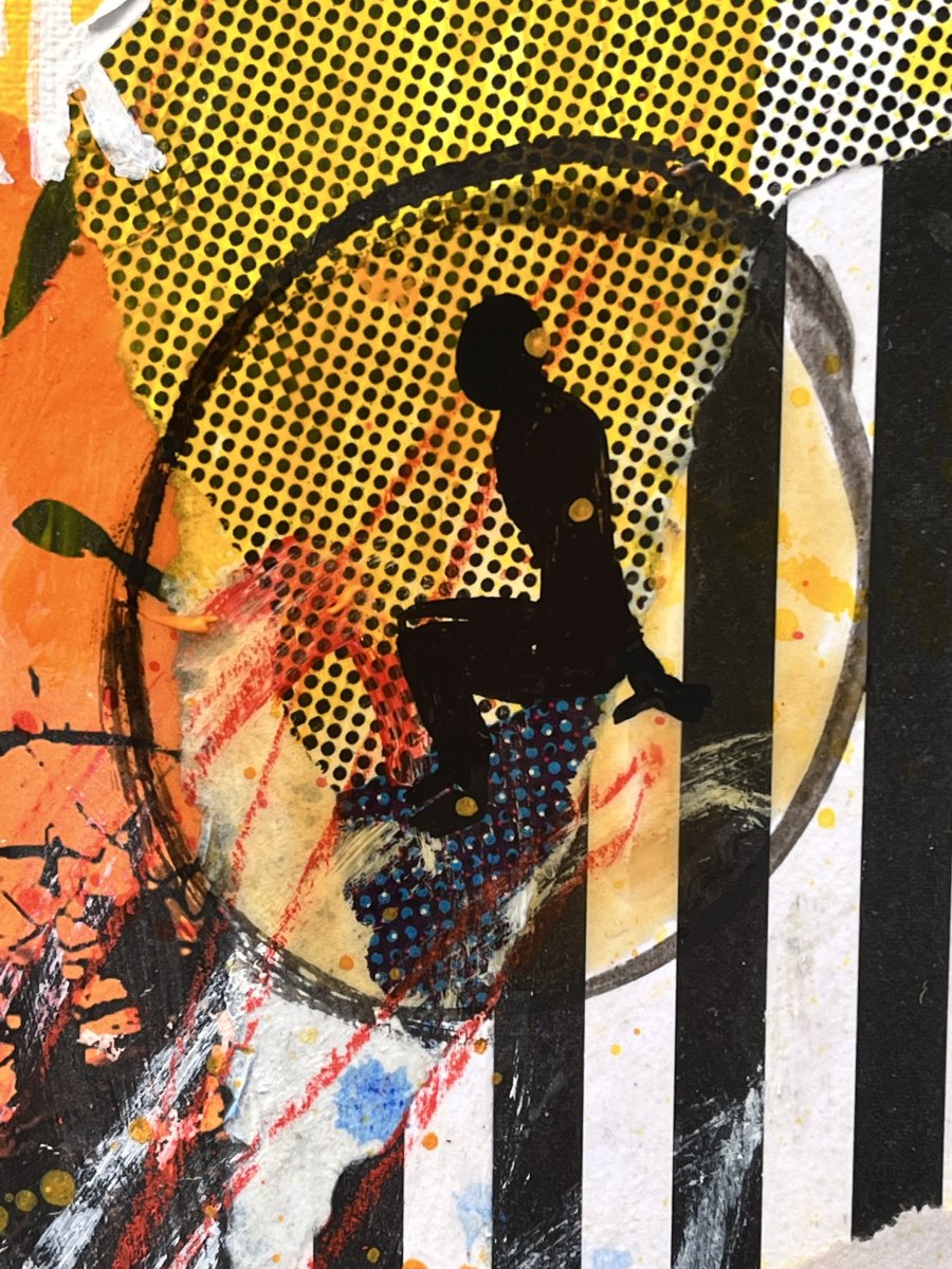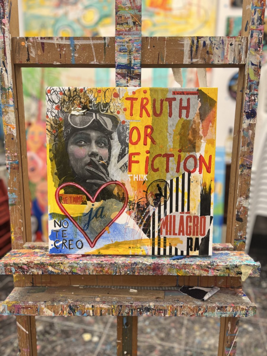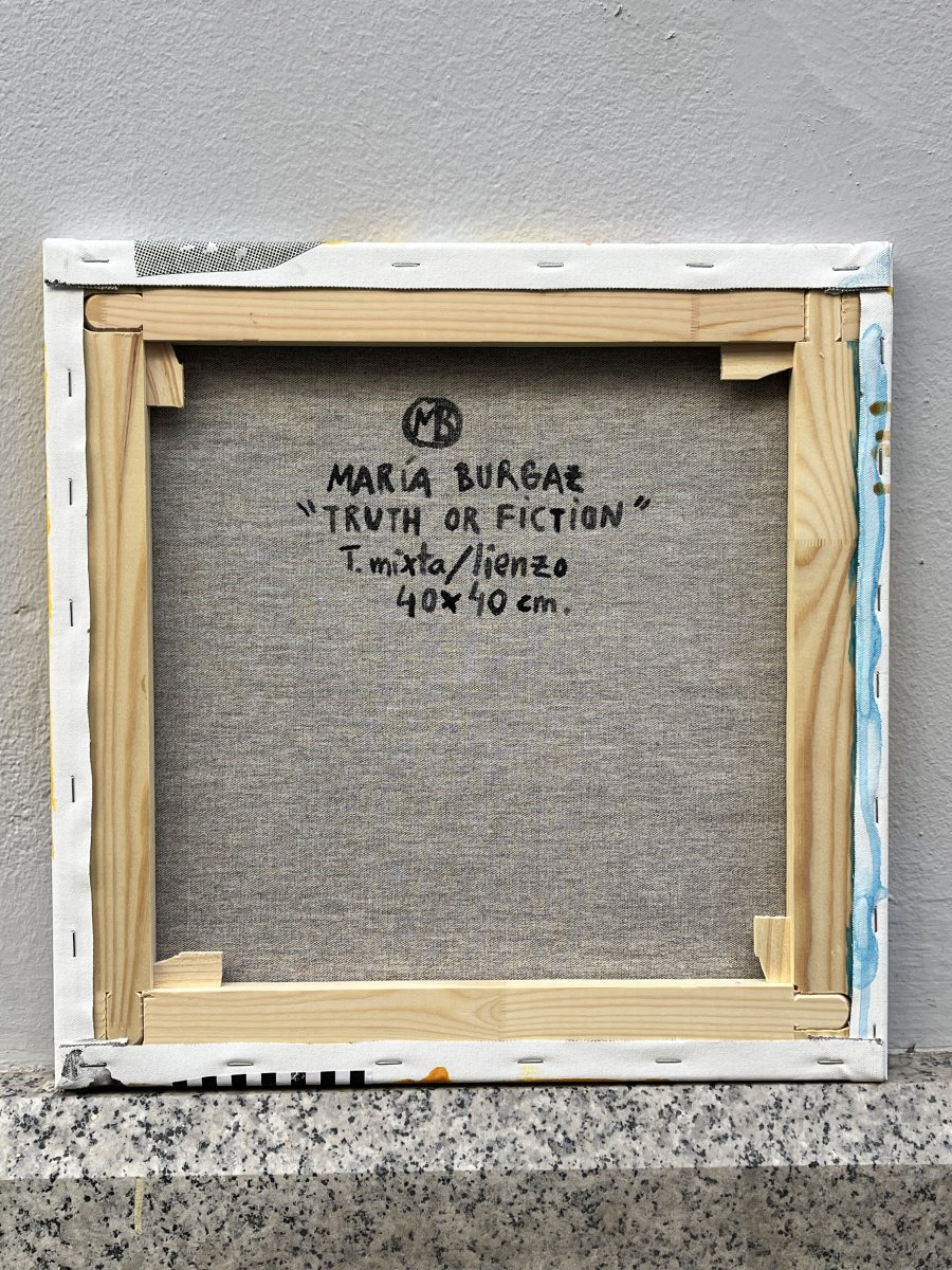 This work is part of the Conversations series, which presents an imaginary dialogue that could continue much further. This piece could be considered a companion to One More Time, but here the woman depicted is a beautiful model. The images may offer us false information, but what matters is what they convey. Fiction and reality are often intertwined, making us doubt, question even love, and laugh at everything. The mixed media technique, as is customary, enriches the work with diverse textures and sensations as we approach it.