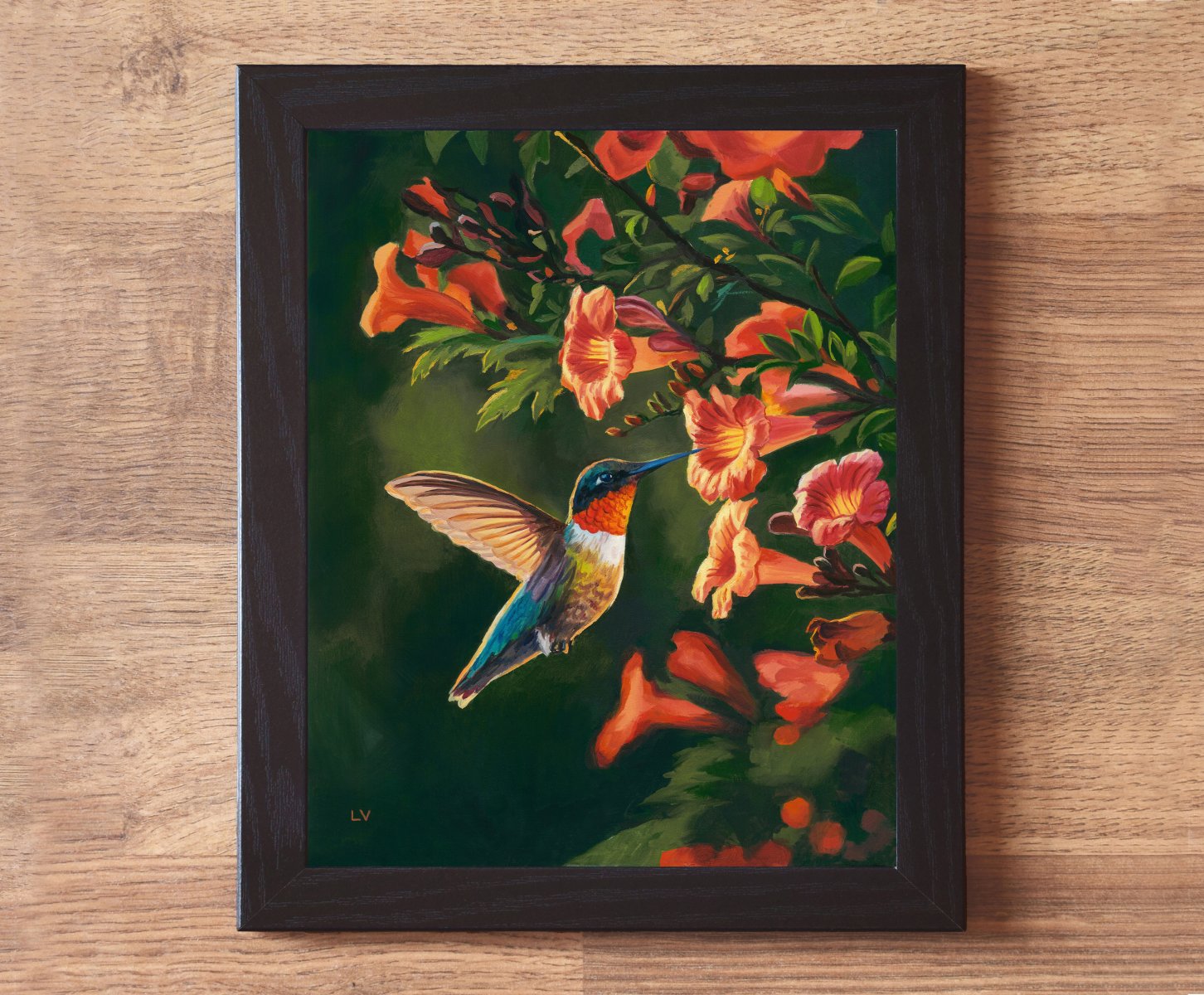 This ORIGINAL oil painting captures the delicacy and energy of a flying ruby throated hummingbird as it feeds on orange and pink trumpet flowers, creating a vibrant and lively scene. The bird’s iridescent hues of blue, green, and red, stand out against the deep green background, lending a sense of movement and natural harmony. It is an ideal piece for those seeking a touch of organic beauty to brighten a space, and a great bird lover or gardener gift!