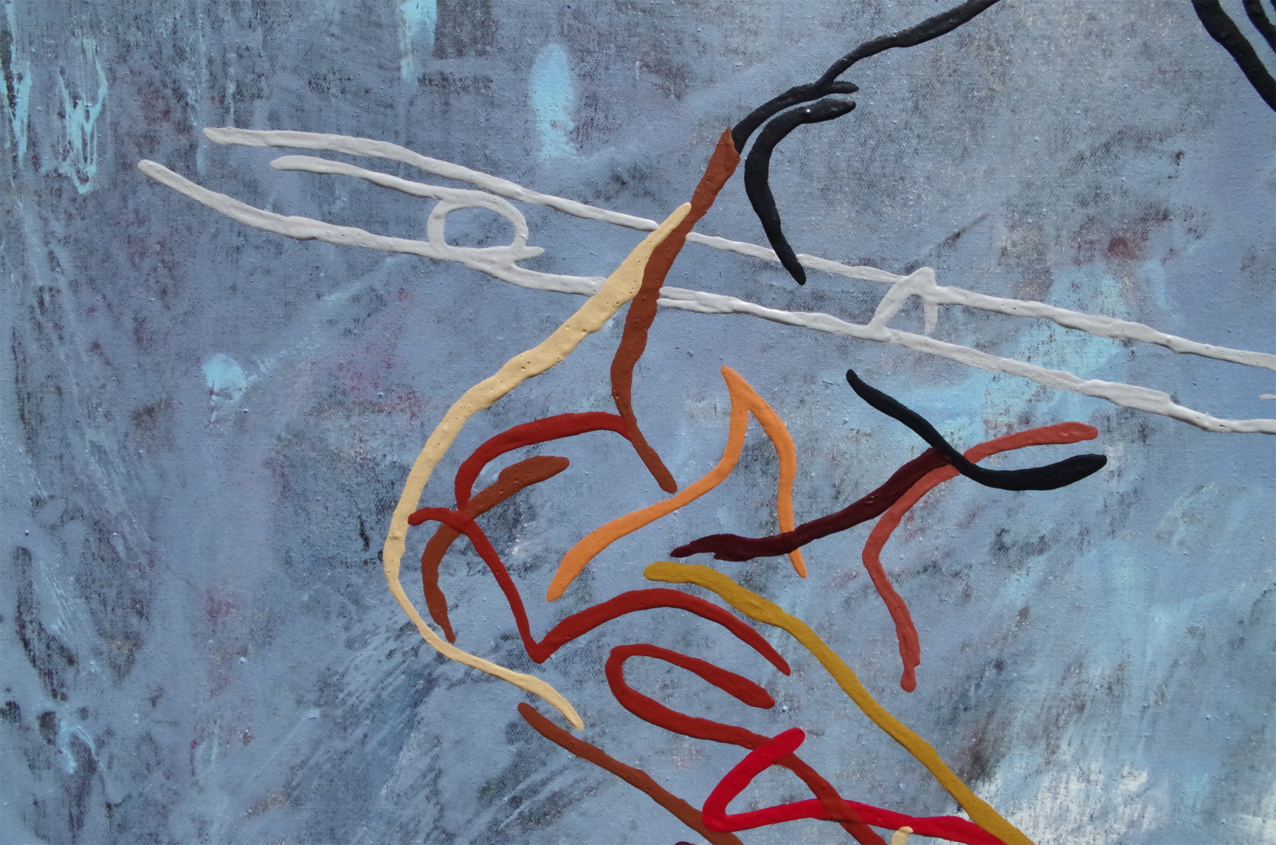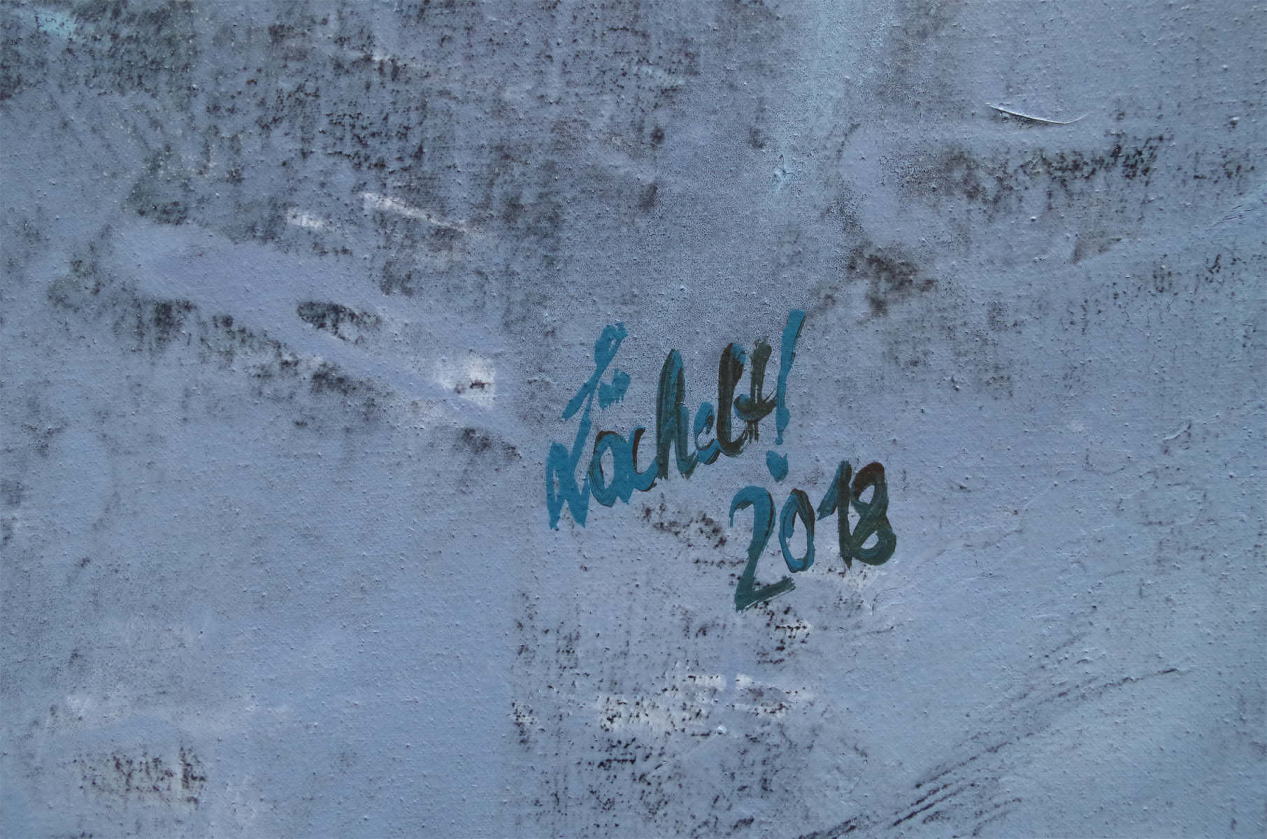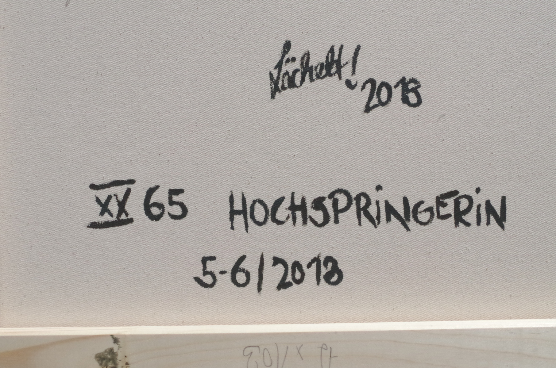 XX 65 - High jumper by Uli Lächelt captures the fluid motion and tension of an athlete in mid-air, suspended above the bar. The painting employs a dynamic interplay of bold, linear strokes in contrasting colors that trace the contours of the figure, emphasizing muscular form and movement. The muted, textured blue background creates a sense of depth and space, allowing the figure to emerge with striking clarity. This work blends abstraction with figurative elements, conveying both the physical exertion and grace inherent in high jumping. Lächelt’s use of painting technique here highlights the energy and precision of the moment, inviting contemplation of athleticism as a form of art. The composition balances spontaneity with control, making it a compelling study of human strength and elegance.