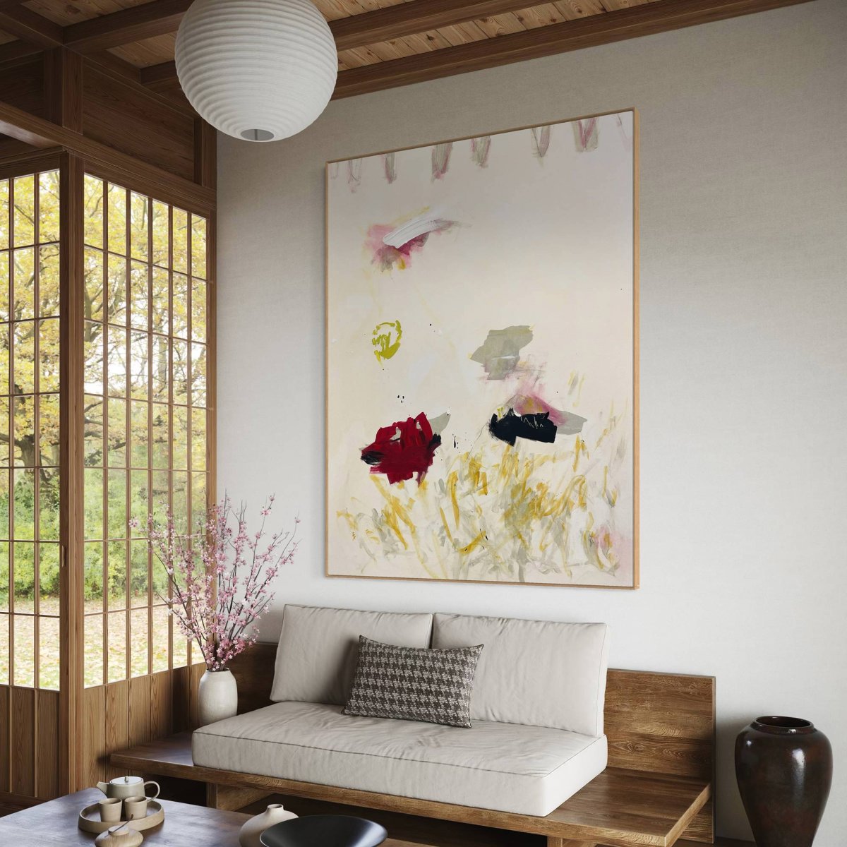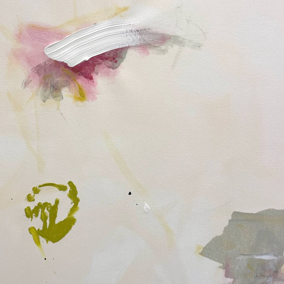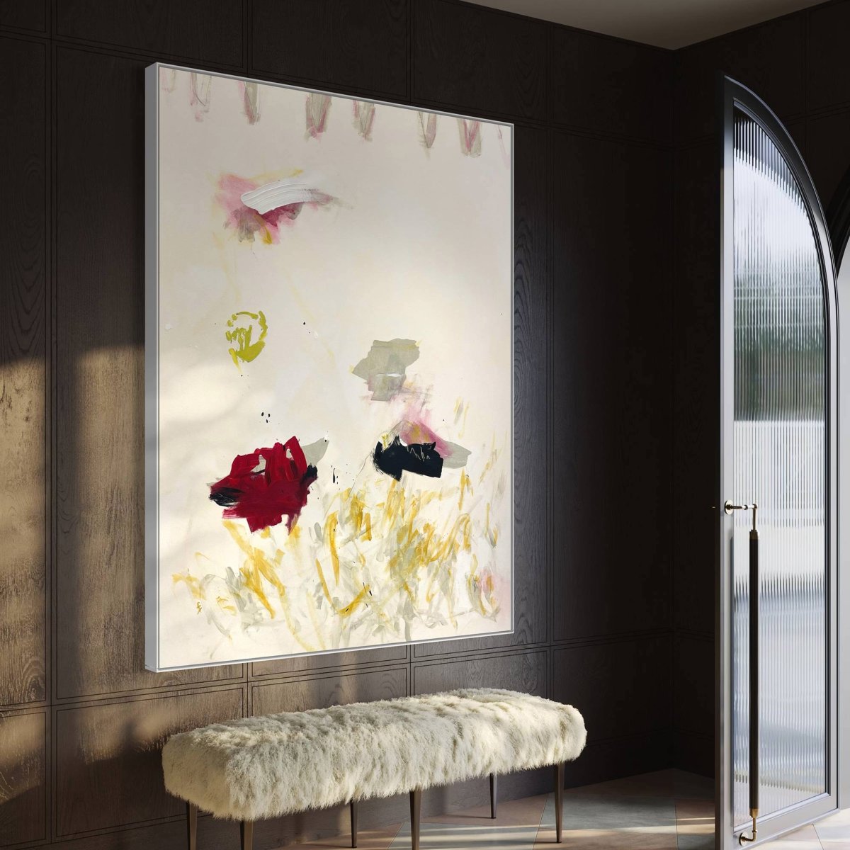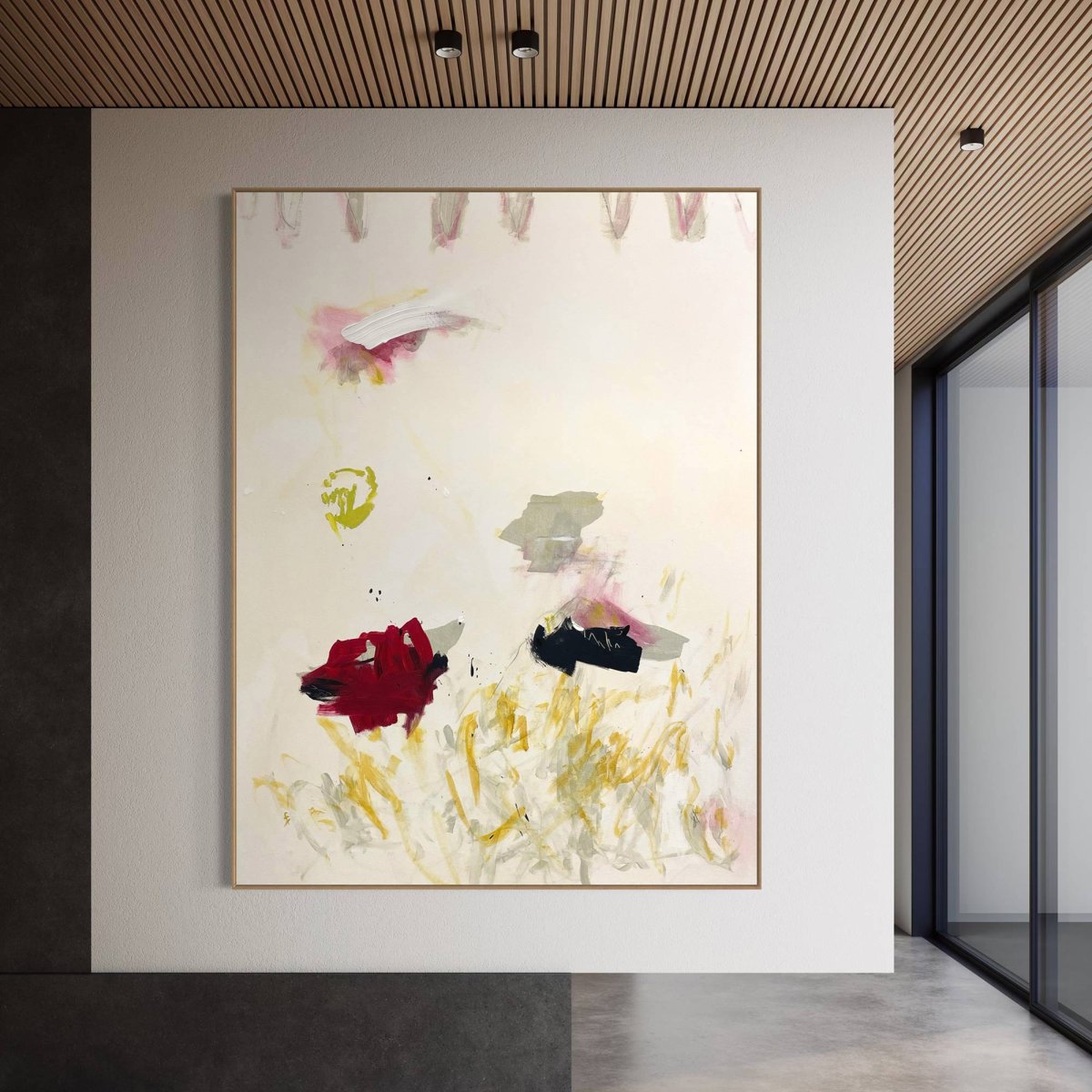 Cheryl Harrisons Sweet Things unfolds as an abstract composition, characterized by dynamic mark-making on an un-stretched canvas. Energetic strokes of yellow ochre and soft grey sweep across the lower portion, contrasting with bold, dense forms in vibrant red and deep black. A striking white impasto stroke floats above a blush of pink and maroon, while subtle pencil lines add intricate detail. This acrylic painting, initialed on the front, is accompanied by a Letter of Authenticity.