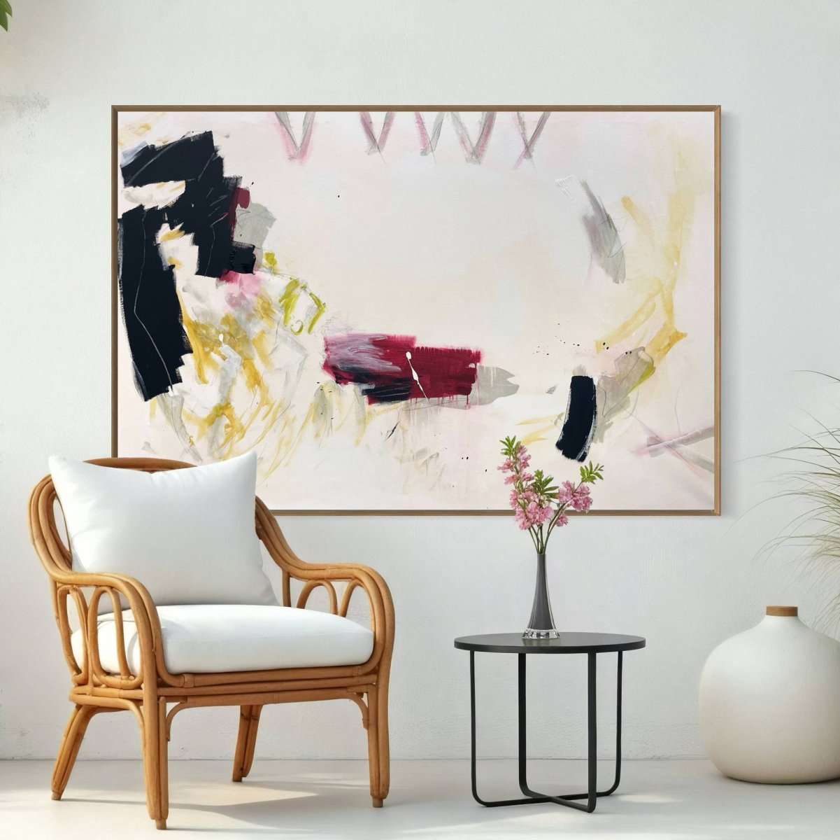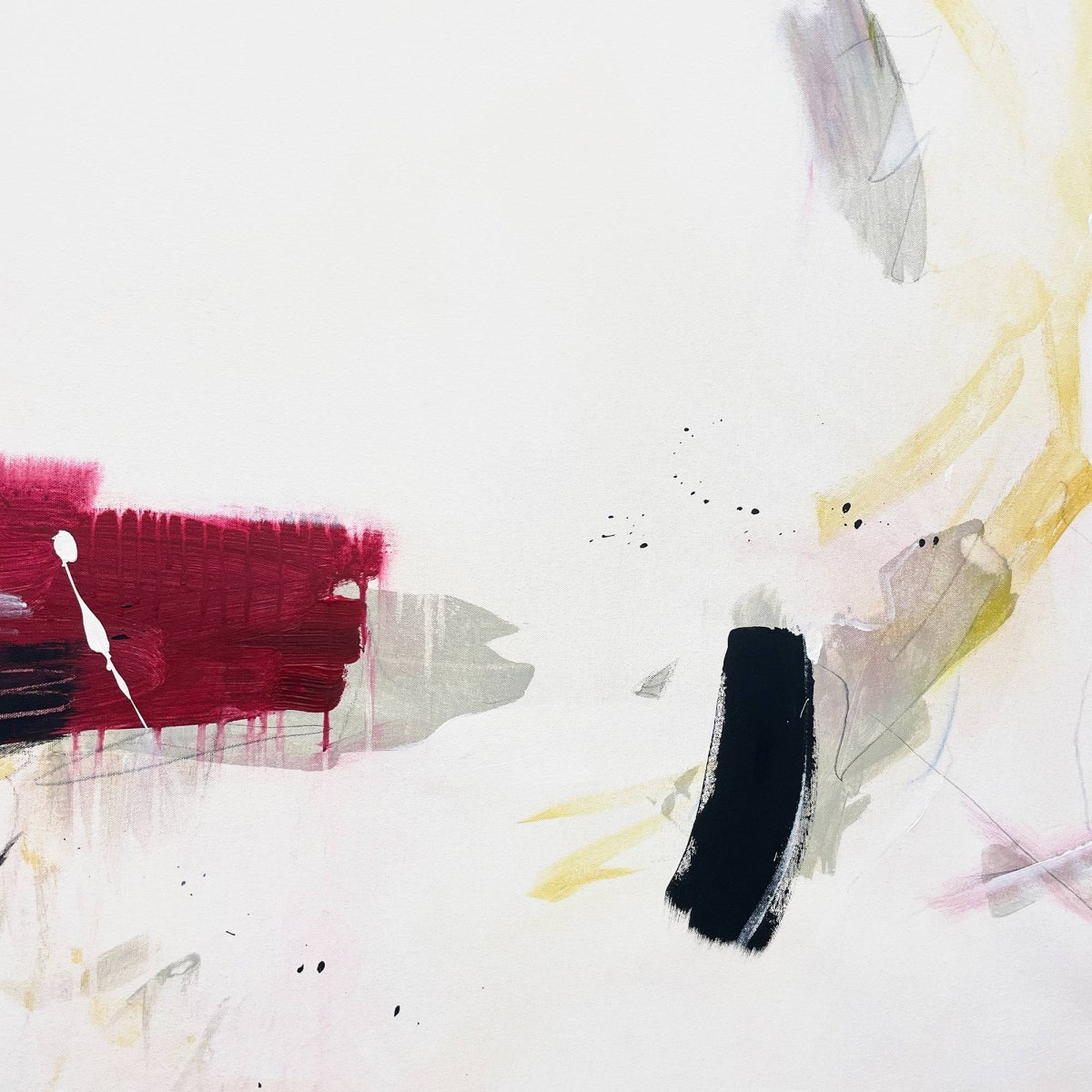 Cheryl Harrisons Gentle Like unfolds as a vibrant abstract composition on an expansive, subtle blush pink wash. Bold, gestural blocks of black anchor the left, counterbalanced by a rich maroon rectangle at the center, layered with dynamic white and dark strokes. Energetic sweeps of yellow ochre and pale green intertwine with softer grey and white passages, while delicate pencil lines and faint pink V shapes add intricate detail. This acrylic and pencil work, initialed on the front and accompanied by a Letter of Authenticity, showcases a complex, balanced palette and spontaneous mark-making.