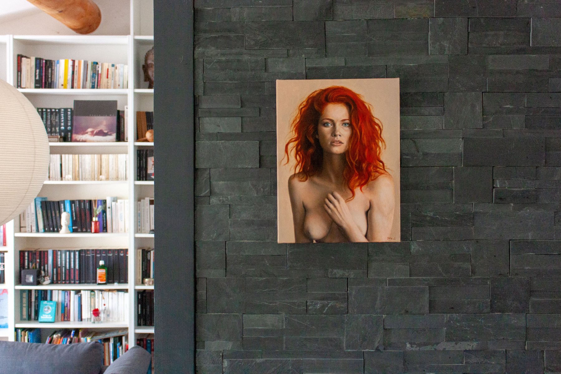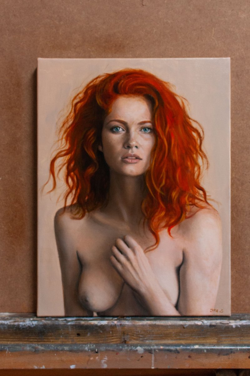 This is a highly detailed, realistic oil painting of Marina, a fair-skinned woman with striking red hair. Marina stands topless, her left hand delicately covering her left breast, with her right arm resting by her side. Her expression is calm and contemplative, with piercing blue eyes looking directly at the viewer. Her hair is voluminous and wavy, cascading down to her shoulders with a rich, fiery red hue that contrasts against her pale skin. The background is a soft, neutral beige, allowing Marinas vibrant hair and skin tone to stand out prominently. As usual, Ive employed smooth, blended brushstrokes to capture the softness of her skin and the texture of her hair. The painting is highly realistic, focusing on natural beauty and the interplay of light and shadow on Marinas form.