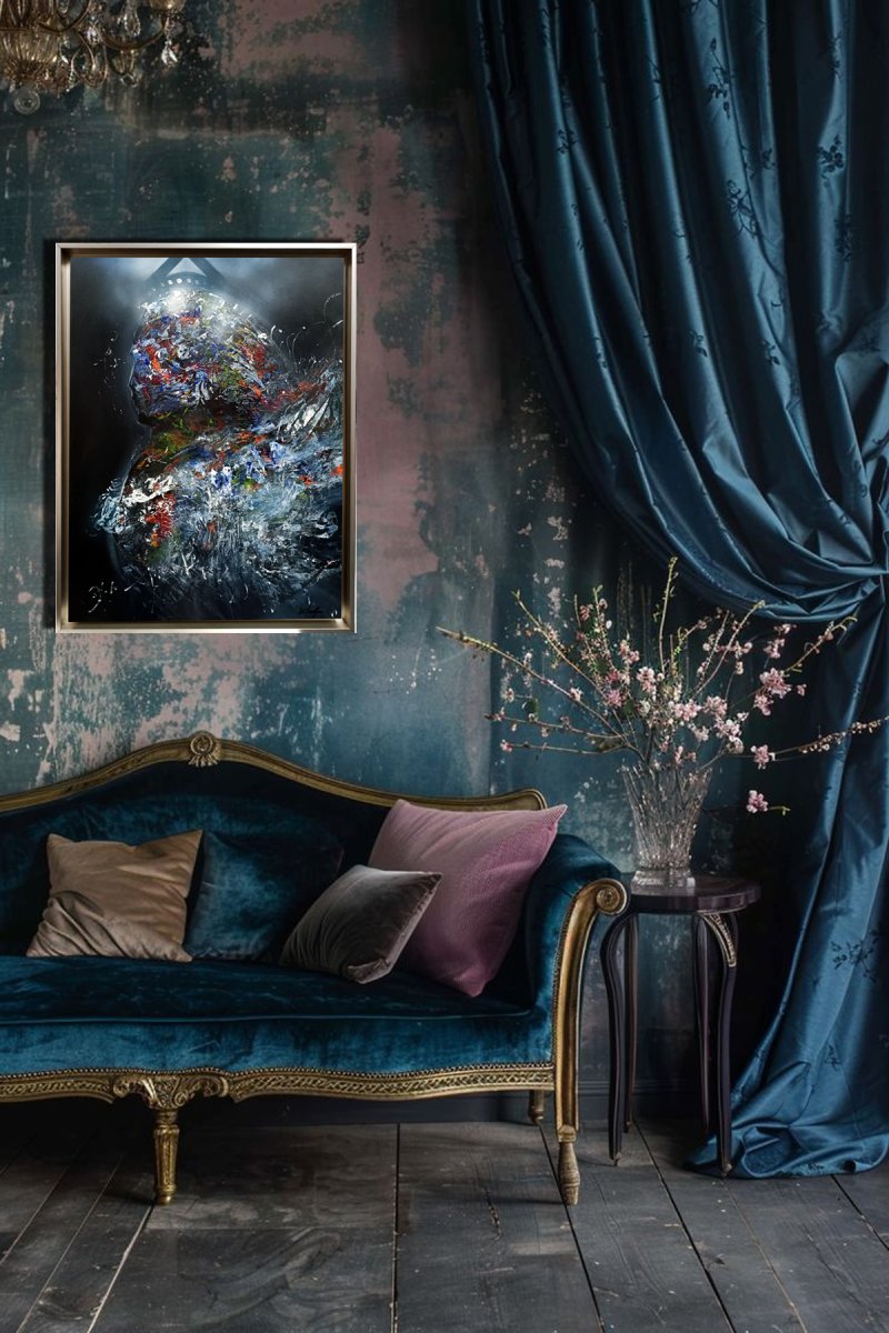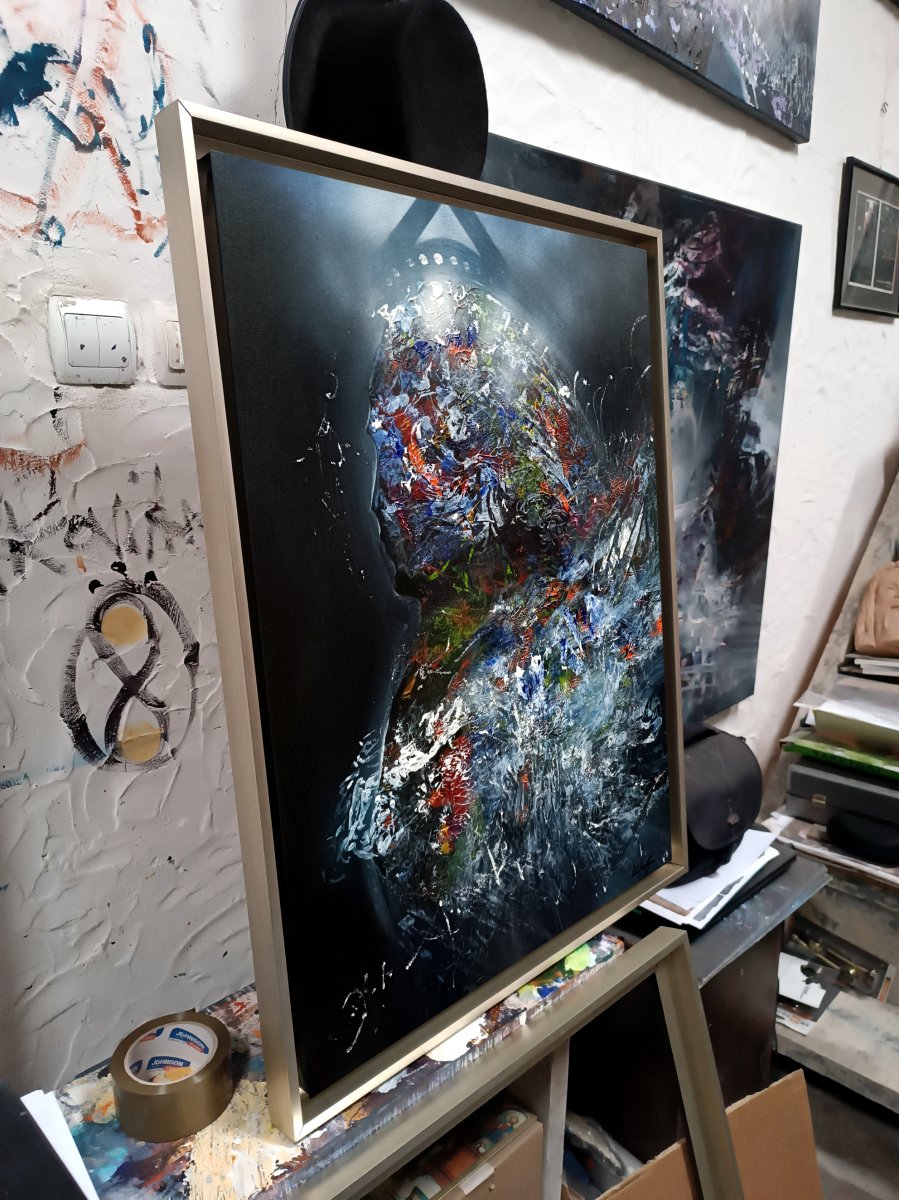 This dimension is decisively supported by the construction of the image. The artist’s practice approaches that of a modeler: color is not simply applied, but built, pushed, and fragmented through an arsenal of unconventional tools—pieces of canvas of various sizes and textures, sticks, cardboard, and materials sourced from construction. This mode of intervention generates a dense, stratified surface in which painting acquires a particular “carnality,” as if the figure were shaped from affected matter rather than optically represented.