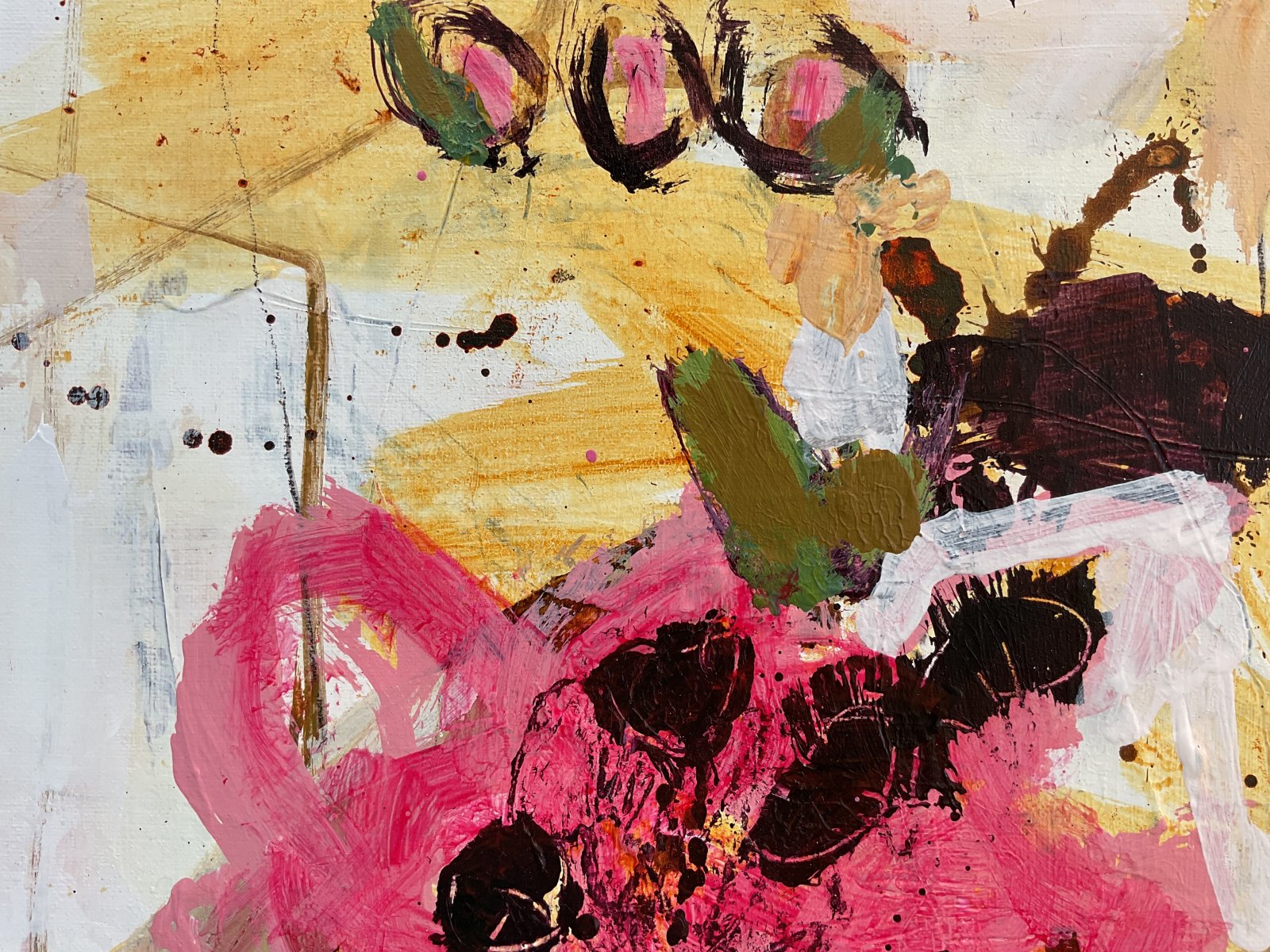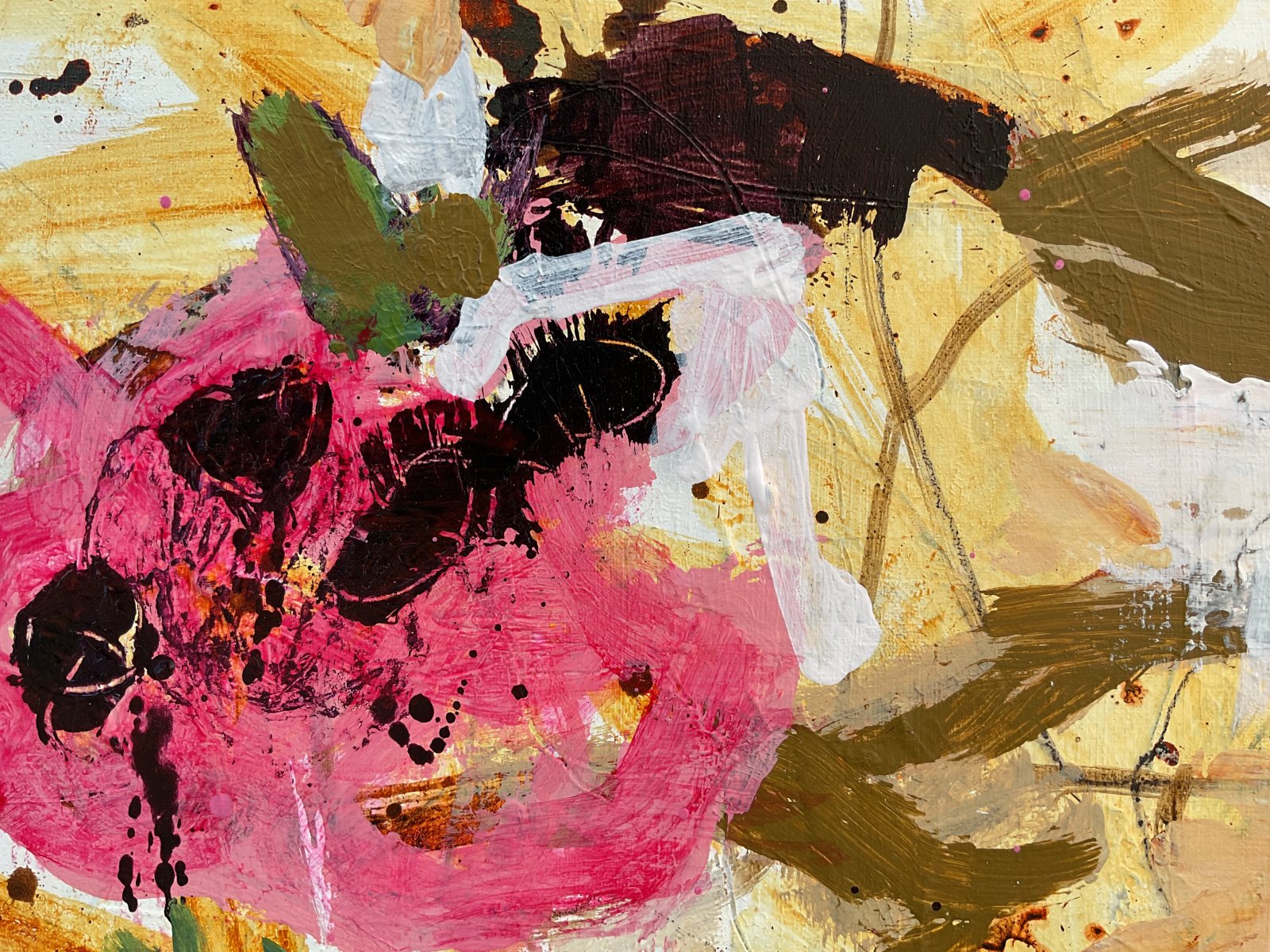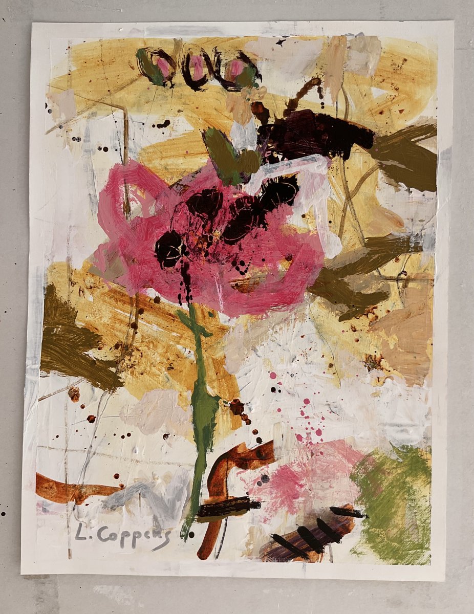 Blossom Mirage features delicate linework in soft greys and creams that form a subtle, light background. Dark browns and red-browns intertwine with flowing ochre shapes, while muted magenta and olive green forms rise to the surface, resembling abstract blooms suspended in a dreamlike state.