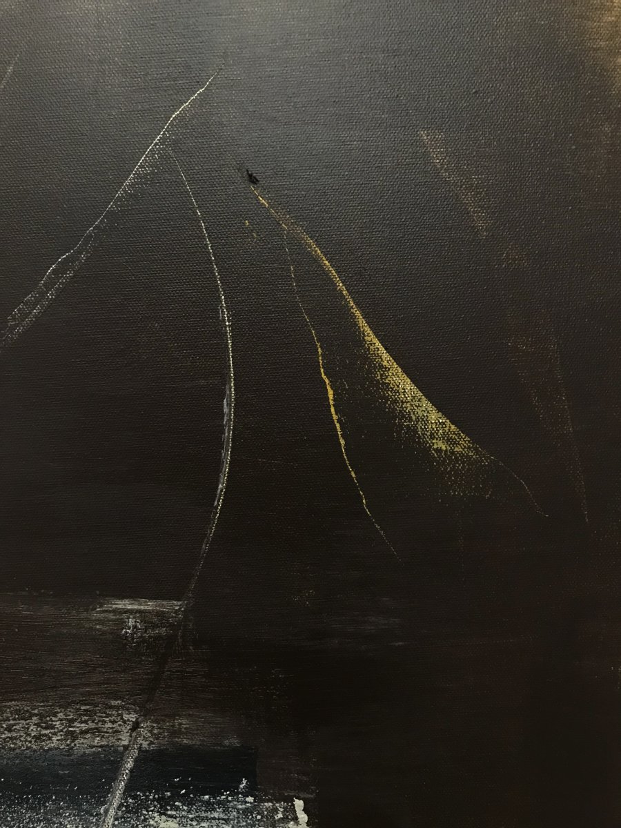 This abstract painting unfolds through layered darkness and softened light, where deep blacks and muted earth tones create a quiet landscape of reflection. Subtle scratches, drips, and worn textures emerge from the surface like traces of memory resurfacing over time. The composition balances weight and stillness, suggesting an inward encounter with the self — a moment of recognition between who we were and who we have become. Rather than presenting a fixed image, the painting invites contemplation, allowing the viewer to experience presence, distance, and emotional resonance within its layered atmosphere.