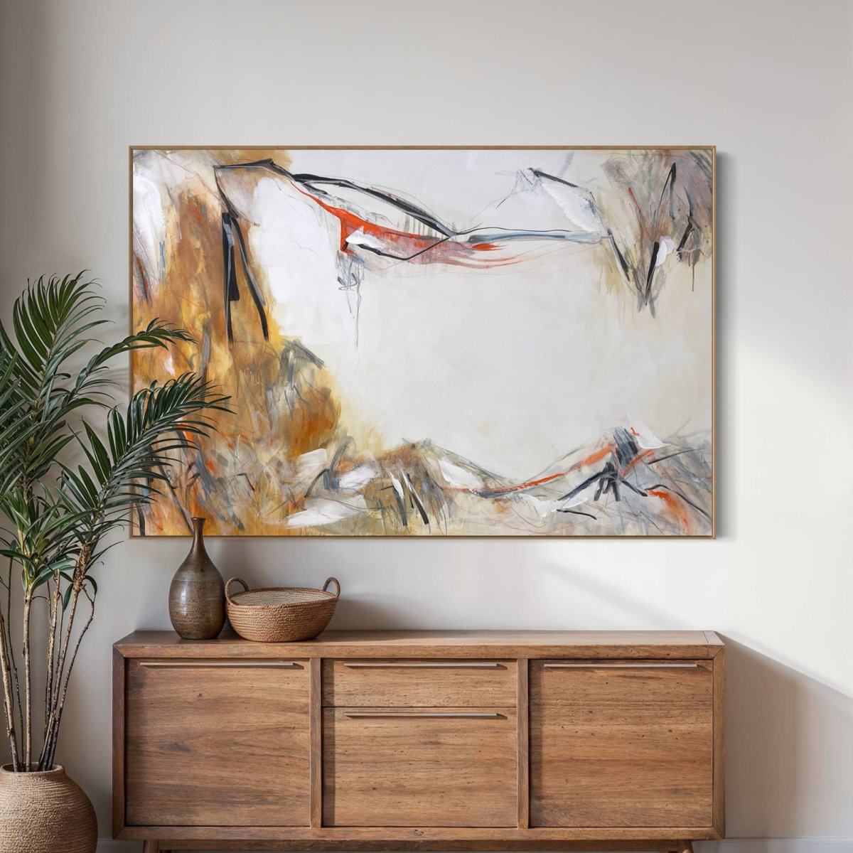 This abstract painting, April Summer, by Cheryl Harrison, features a dynamic interplay of warm ochres, stark blacks, and vibrant orange against a luminous white ground. Energetic brushstrokes create textured fields on the left and bottom, punctuated by bold, calligraphic lines that define fluid forms. Delicate grey and black scribbles add depth, while striking orange accents introduce bursts of color, guiding the eye through the compositions expansive central space. The work balances robust gestures with ethereal transparency, evoking a sense of vibrant movement.