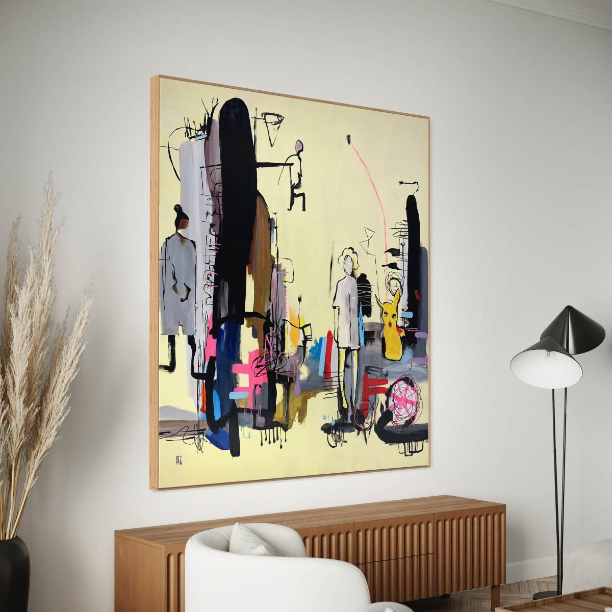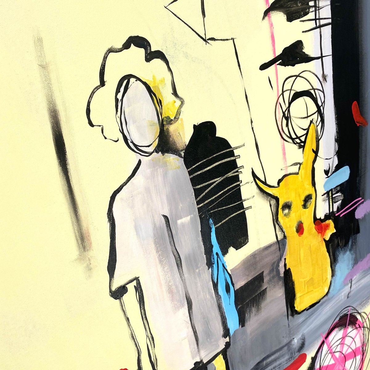 Large figurative abstract of on a ground of warm off-white/yellow with dramatic coloured linework.