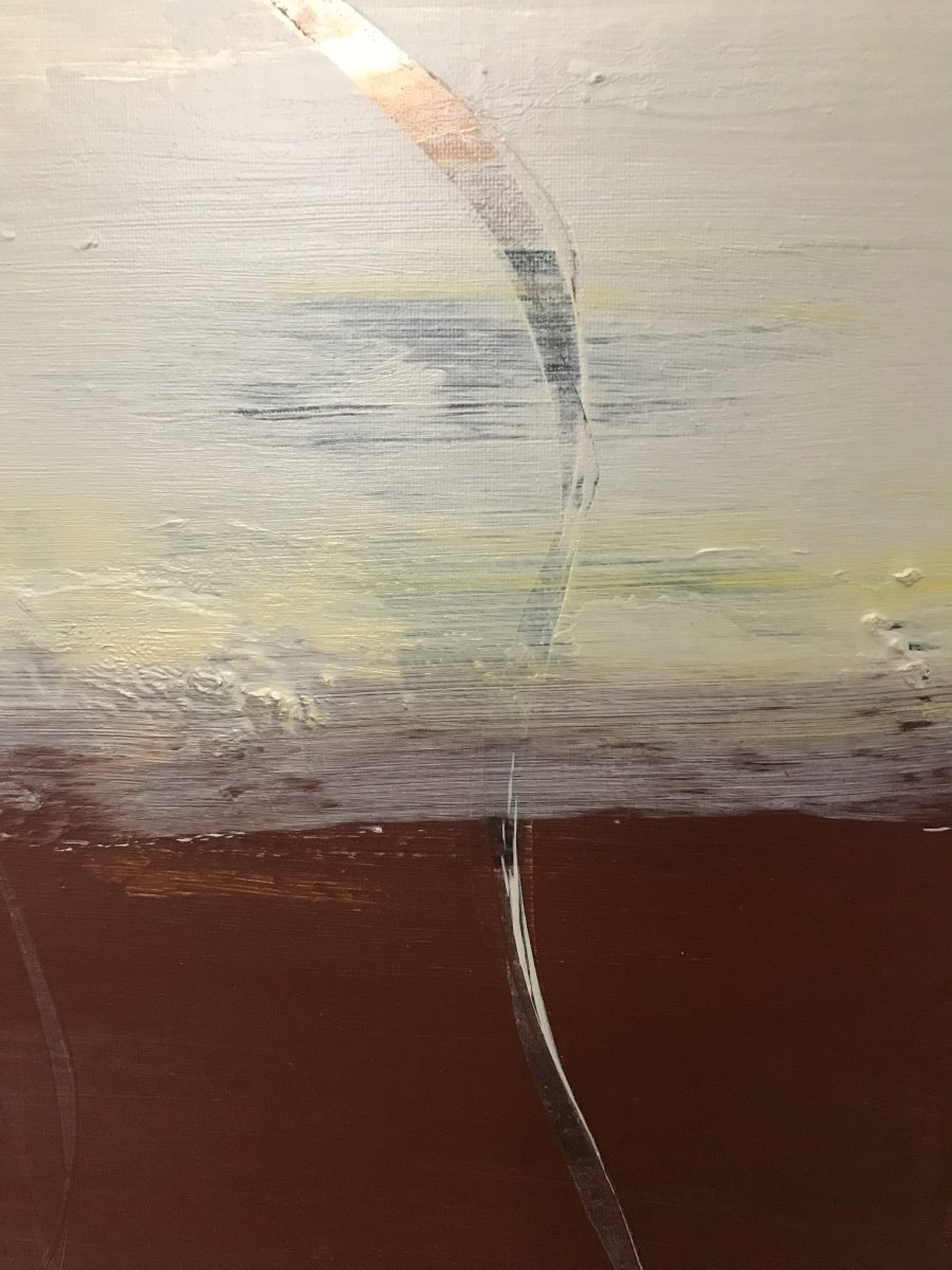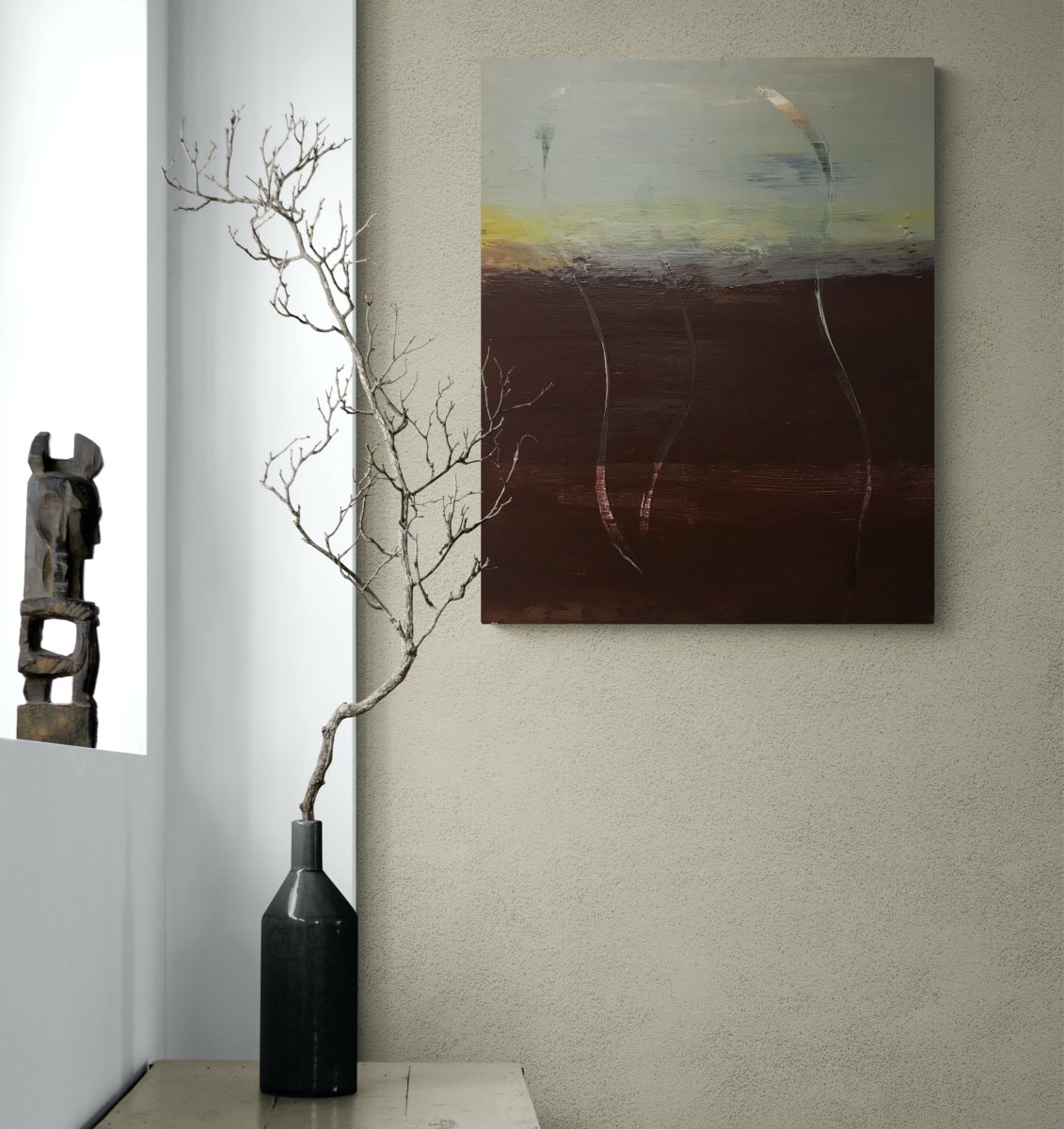 This abstract painting unfolds through layered darkness and softened light, where deep blacks and muted earth tones create a quiet landscape of reflection. Subtle scratches, drips, and worn textures emerge from the surface like traces of memory resurfacing over time. The composition balances weight and stillness, suggesting an inward encounter with the self — a moment of recognition between who we were and who we have become. Rather than presenting a fixed image, the painting invites contemplation, allowing the viewer to experience presence, distance, and emotional resonance within its layered atmosphere.