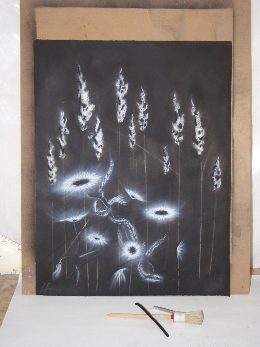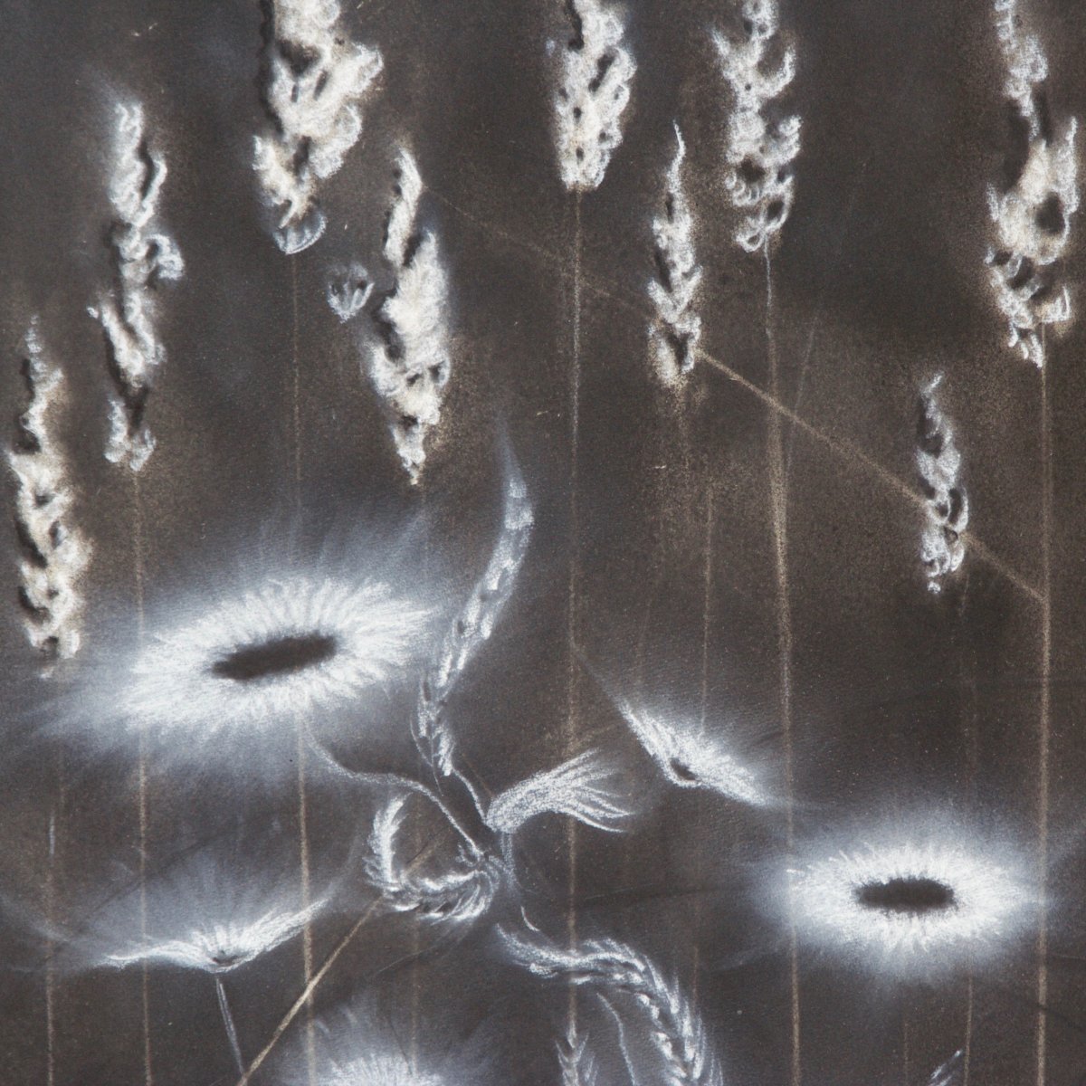 This work, a finely balanced combination of pochoir printing and drawing, transforms cornflowers and grasses into an almost dreamlike play of light. The blossoms do not appear as solid forms, but as radiant centers surrounded by soft, diffused edges—like small sources of light emerging from the depth of the dark background. The drawn lines of the grasses rise calmly and upright, giving the composition a quiet sense of order.