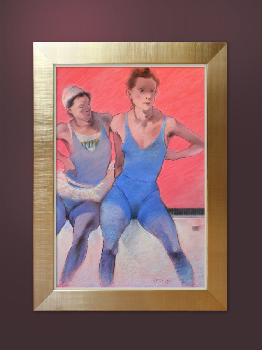 Two dancers in pastel, before departing for a French holiday I was unsure of the colour combinations and left it unfinished. A visit to Chartres Cathedral and its wonderful blue stained glass windows was an inspirational pointer to the colours I eventually chose. A Studland coloured board was used for this pastel as I like the rigidity and fine surface. This artwork has been finished with a fixative because of its absorbency. So the artwork should be framed with a mount and under glass. I recommend at least a 60mm wide frame, narrow frames on large paintings do not sit well and have a tendency to warp.