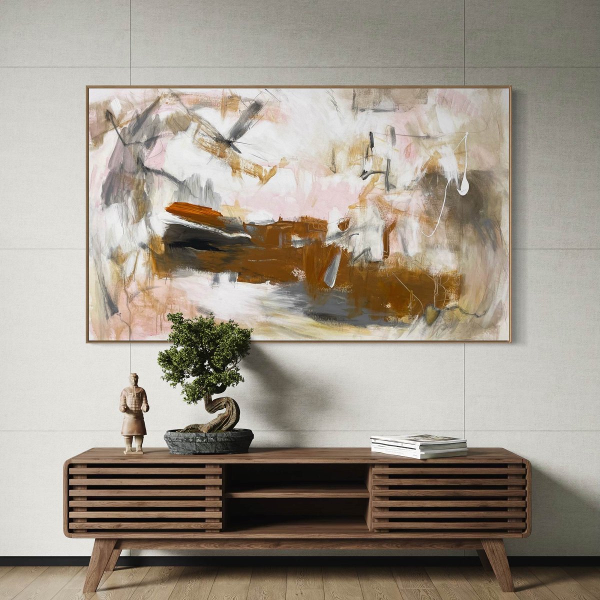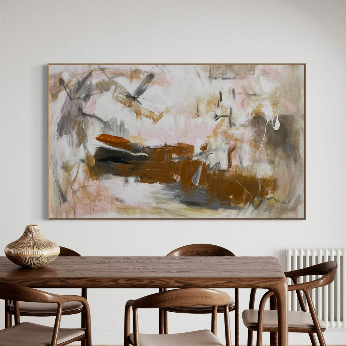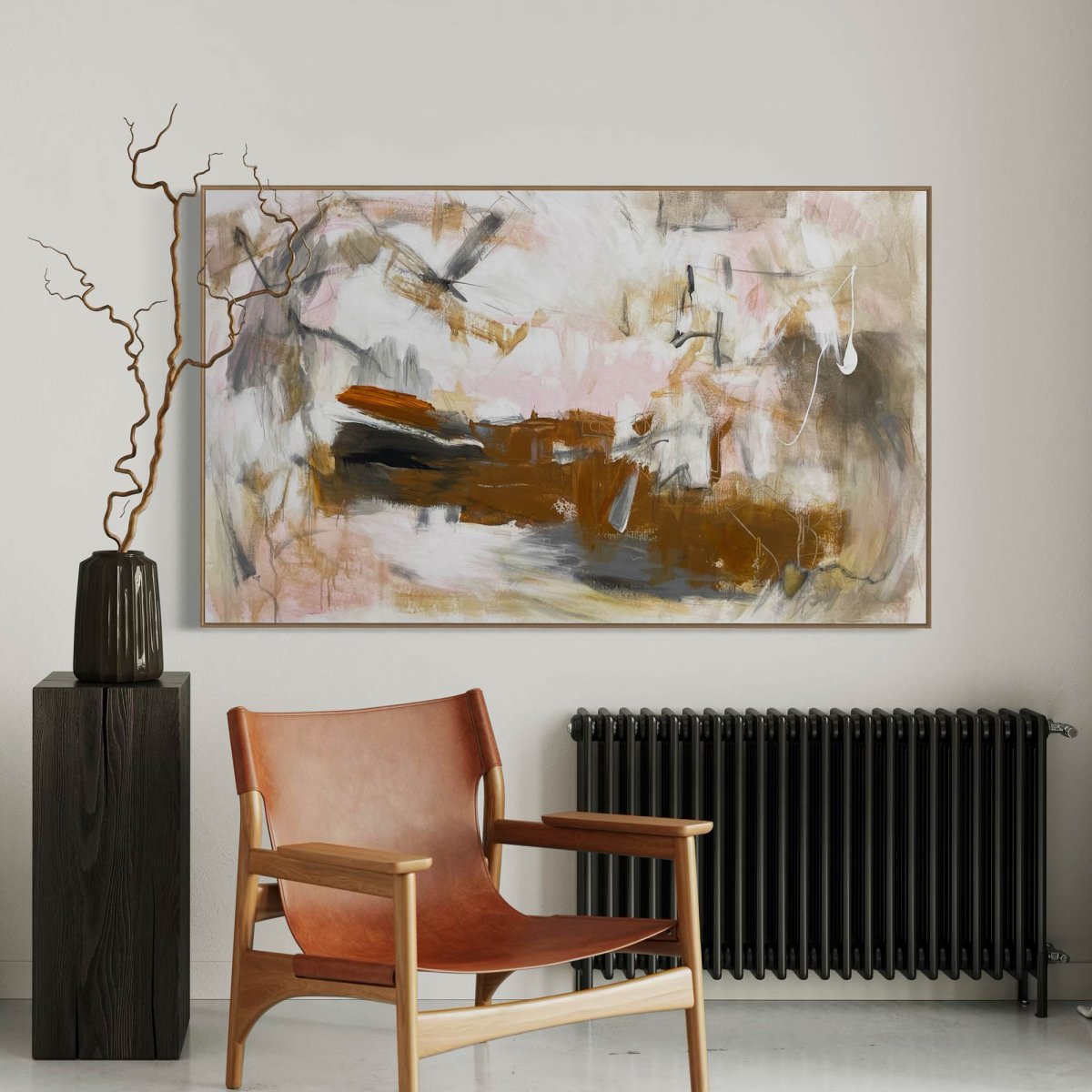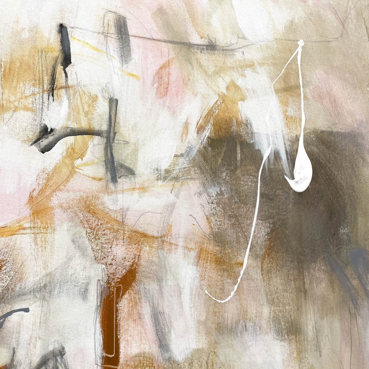 Grounded by Cheryl Harrison presents an abstract landscape of expressive gestures and layered tones. Broad washes of warm ochre, deep brown, and soft blush pink anchor the composition, punctuated by energetic grey and black strokes. A vibrant horizontal dash of orange acrylic adds a focal point, while delicate pencil lines weave through the fluid forms, creating a sense of dynamic movement. Executed in acrylic on un-stretched canvas, the work is initialed on the front and accompanied by a Letter of Authenticity.