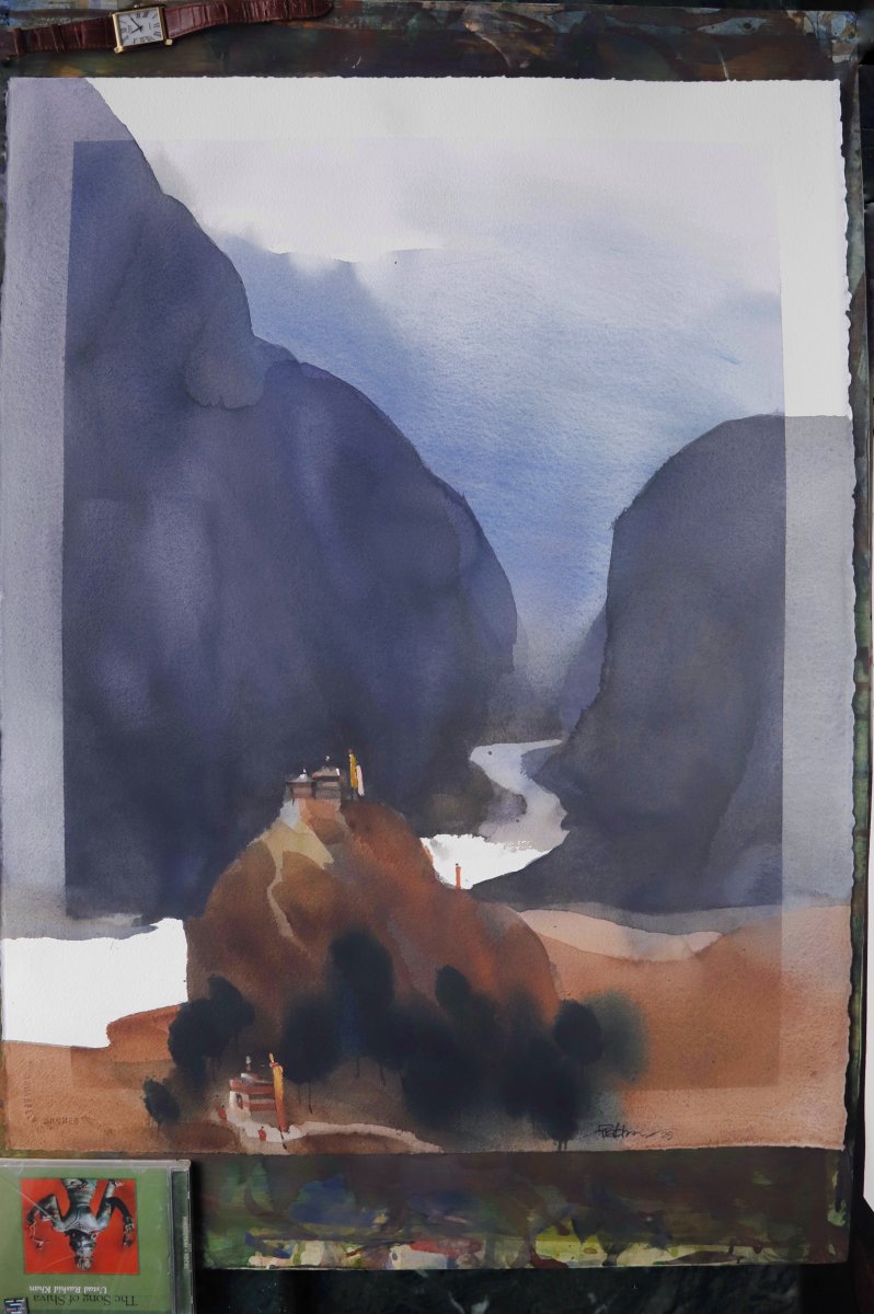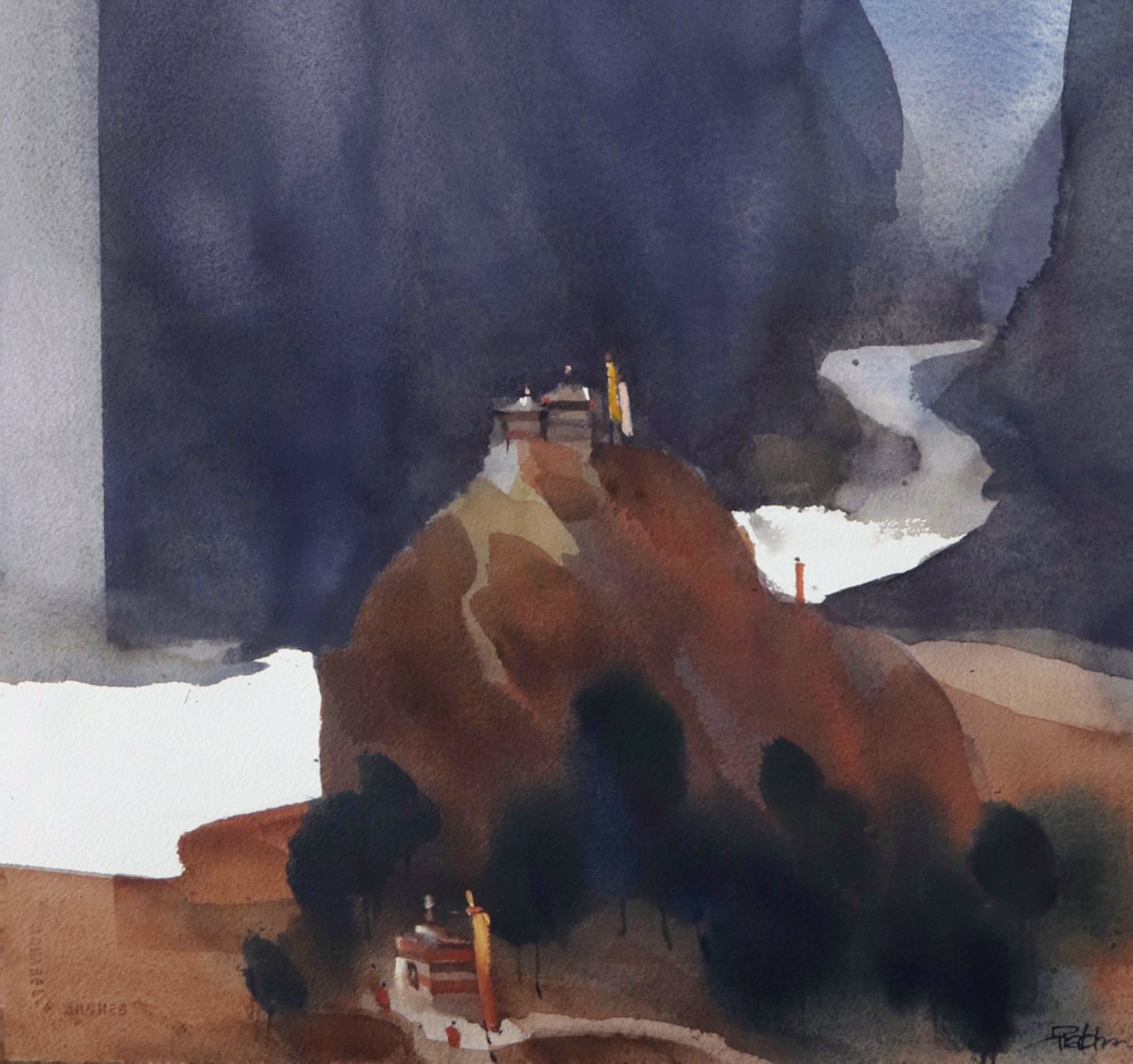 On Arches 300gsm pure cotton archival paper, this piece is painted in archival Japanese watercolours. Inspired by memories of travels around Spiti valley in Himalayas, the artwork is painted in my minimalist visual approach.