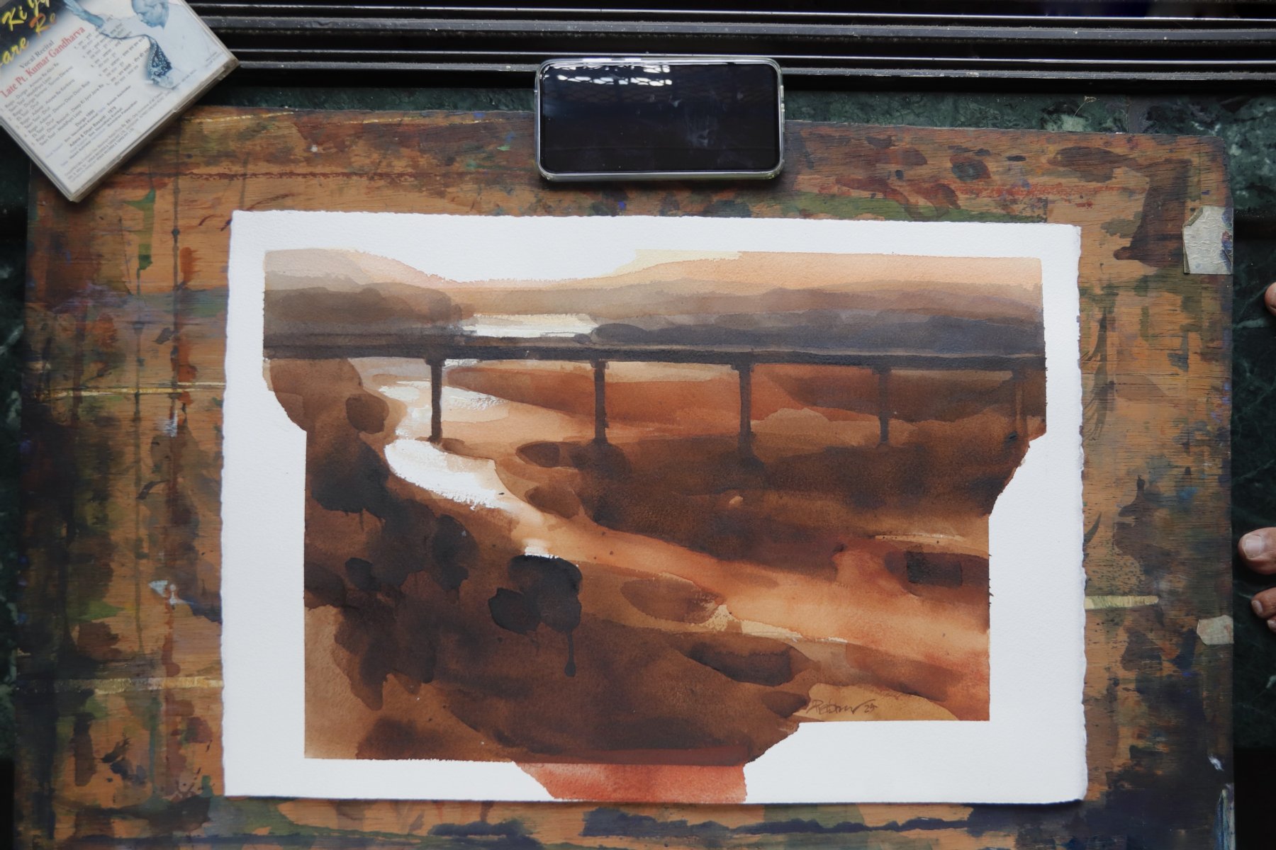 In my minimalist visual approach, the artwork was painted in studio, using photos taken on train journey through central Indian countryside.