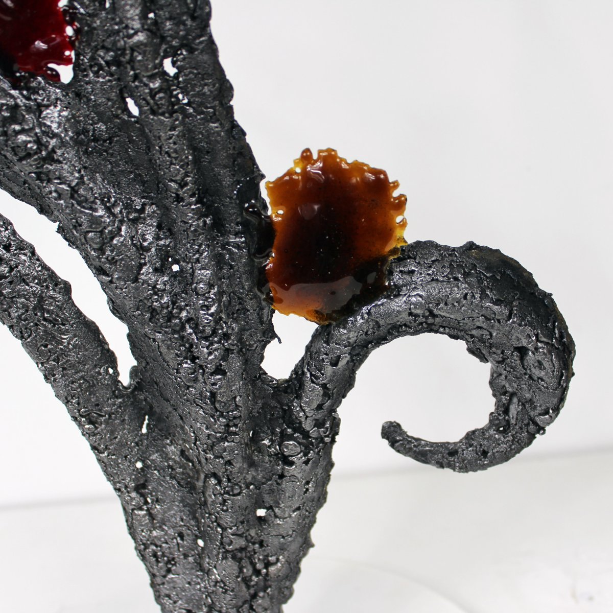Crafted using the artist’s signature lace steel technique, this delicate openwork structure evokes a stylized leaf or blooming flower, frozen in a moment of organic expansion. Embedded within the steel are vibrant fused glass elements, appearing like miniature suns or blossoming petals, bringing color, energy, and movement into the piece.