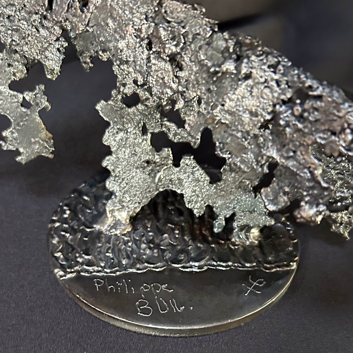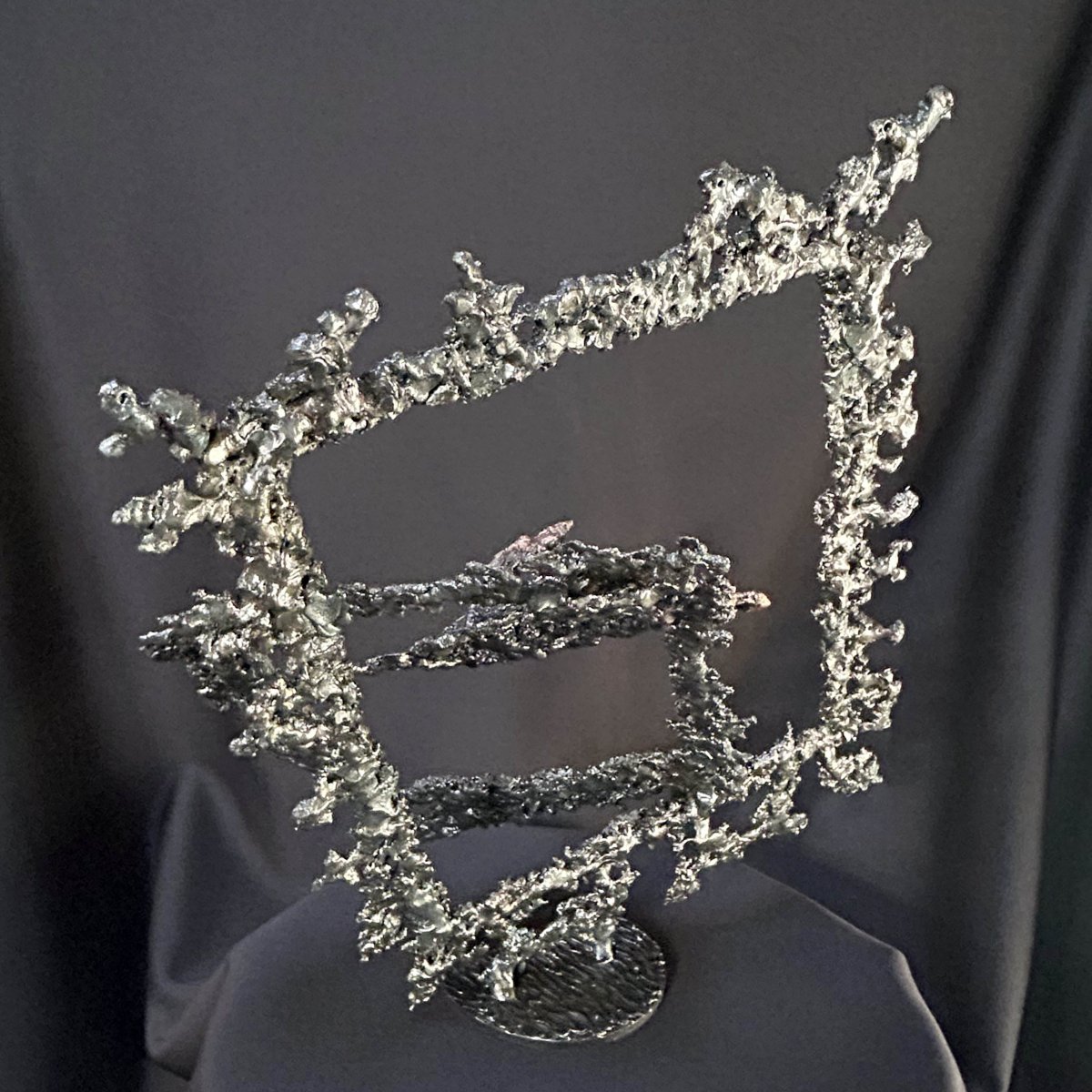 While the structure appears precise and architectural at first glance, the material tells another story. The edges dissolve into irregular, organic textures, shaped by Buil’s signature metal lace technique. Molten steel and bronze flow freely, creating a delicate network that both supports and disrupts the geometry.