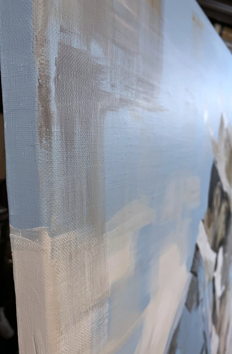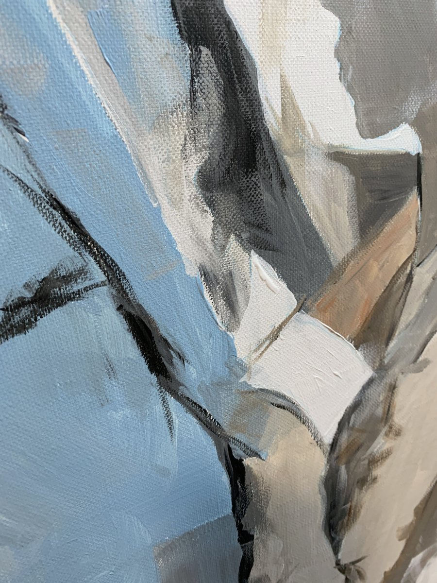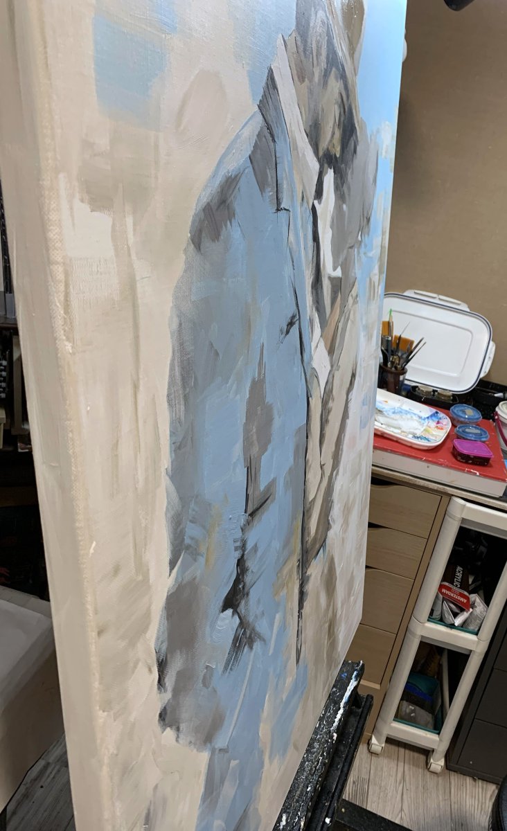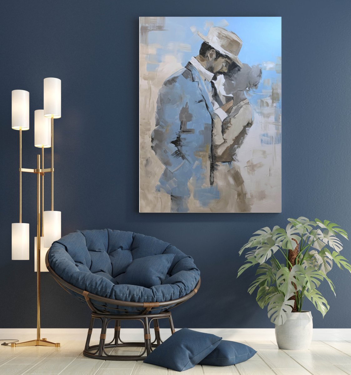 This elegant, vertical painting captures a quiet and intimate moment between man and woman, a love couple, their forms blending together in a gentle embrace. The soft, muted color palette and bold, confident strokes convey a feeling of timeless romance and powerful, unspoken emotion. This piece is a perfect focal point for a bedroom or a cozy living room, offering a beautiful tribute to human connection and tender affection.