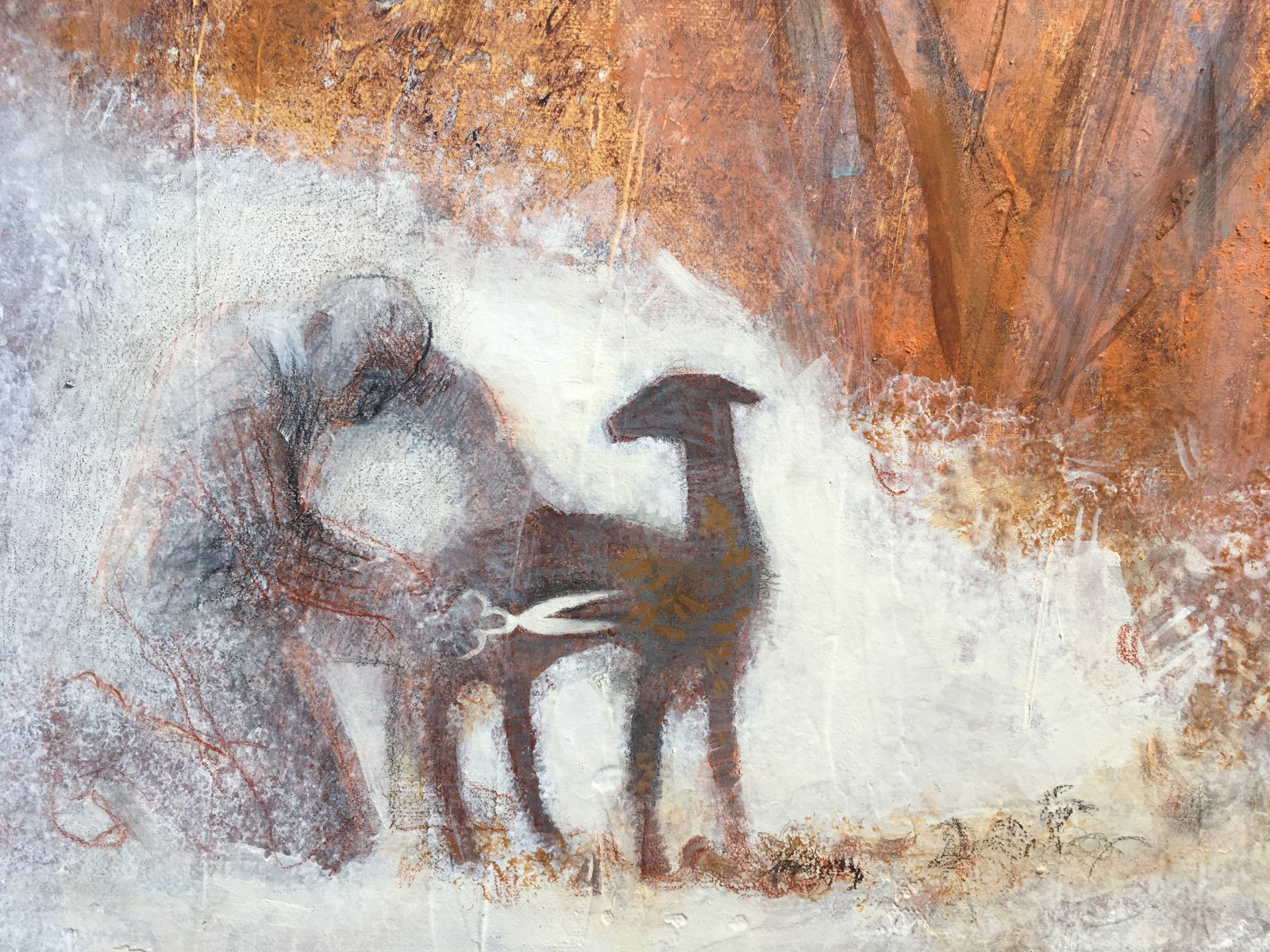 This work is part of a series about Armenia and Georgia that I have never visited. It is about the unity of all things in the world. About the union of nature in which man lives, his culture and work. The mountains, the soft sheeps wool falling from under the shearer’s hands, and the clouds seem created from the same material. A flock of sheep glides like clouds across the mountain tops. A blue sky peeks through them, like the sheepherders dreams of abundance and prosperity.
