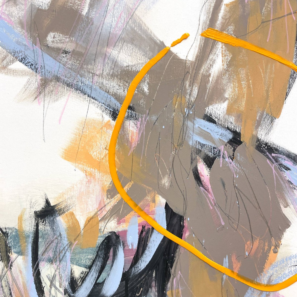Cheryl Harrisons abstract painting presents a vibrant central explosion of color and form. Deep blues, rich browns, and stark blacks coalesce in a dynamic cluster of expressive brushstrokes, punctuated by electric pink and bright yellow accents. Delicate, swirling lines weave through the painted mass, adding a layer of intricate detail and texture. The energetic application of paint creates a sense of spontaneous movement, contrasting with the expansive white background. Isolated marks in the lower sections echo the main palette, grounding the composition with subtle visual anchors.