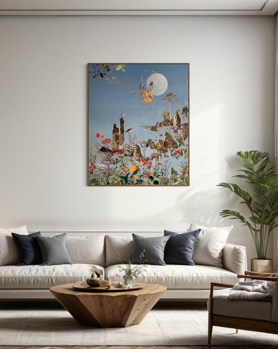 The world is in turmoil, everything is changing, and change has also arrived in paradise. The landscape is dominated by comets flying through the air, rock formations that are about to collide. In my collage, I interweave surreal and symbolic elements on paper to create a dreamlike scene. I play with contrasts and structures by bringing cartographic fragments and everyday scenes into dialogue. The combination of floating lightness and earthy connection invites reflection on space, time, and our individual paths.