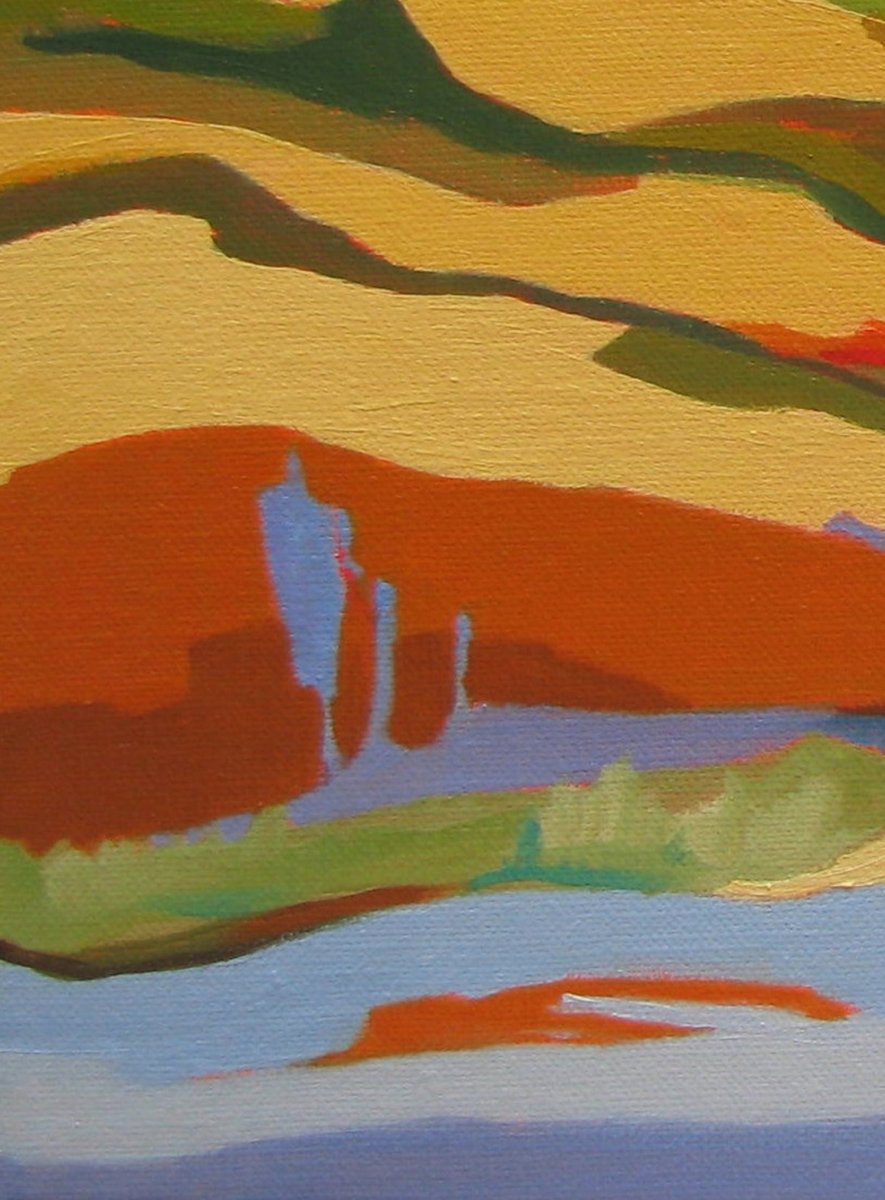 This original oil painting captures the serene beauty of Lake Salagou in southern France. The artist employed a minimalist approach, focusing on the essential elements of the landscape. Notice the mountain in shadow, the vibrant red ochre earth and rocks, and the delicate reeds along the water's edge. The sky's reflection shimmers on the lake's surface, creating a captivating interplay of light and color.