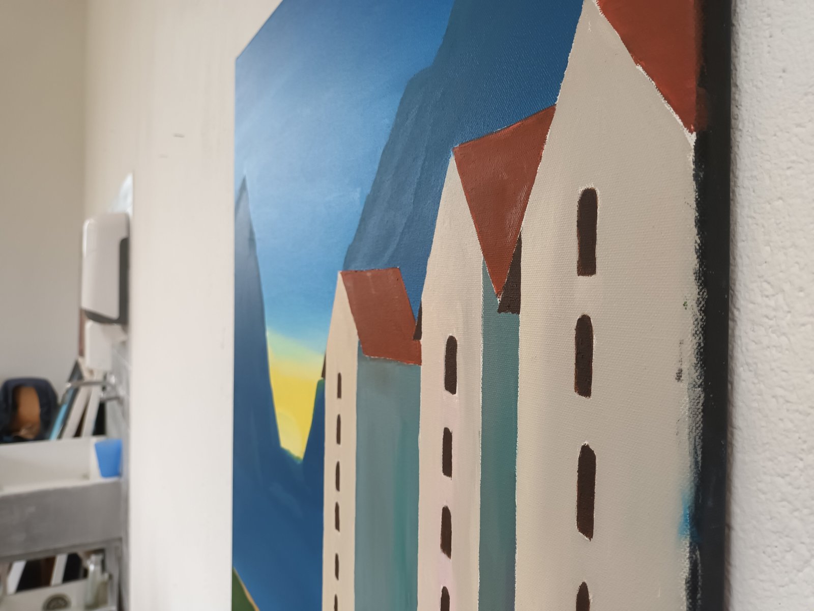 The painting depicts an impressive landscape scene bathed in the soft light of evening. Three large houses dominate the picture – they rise up like mighty towers and their shape is reminiscent of castles or fortresses. In the background, majestic mountains rise up, their silhouettes slowly blurring in the haze of the warm glow of the setting sun. The evening light bathes the entire scene in golden and purple tones, creating a calm, almost mysterious atmosphere. The combination of monumental architecture and impressive natural scenery conveys a quiet, contemplative mood and leaves room for personal interpretation.