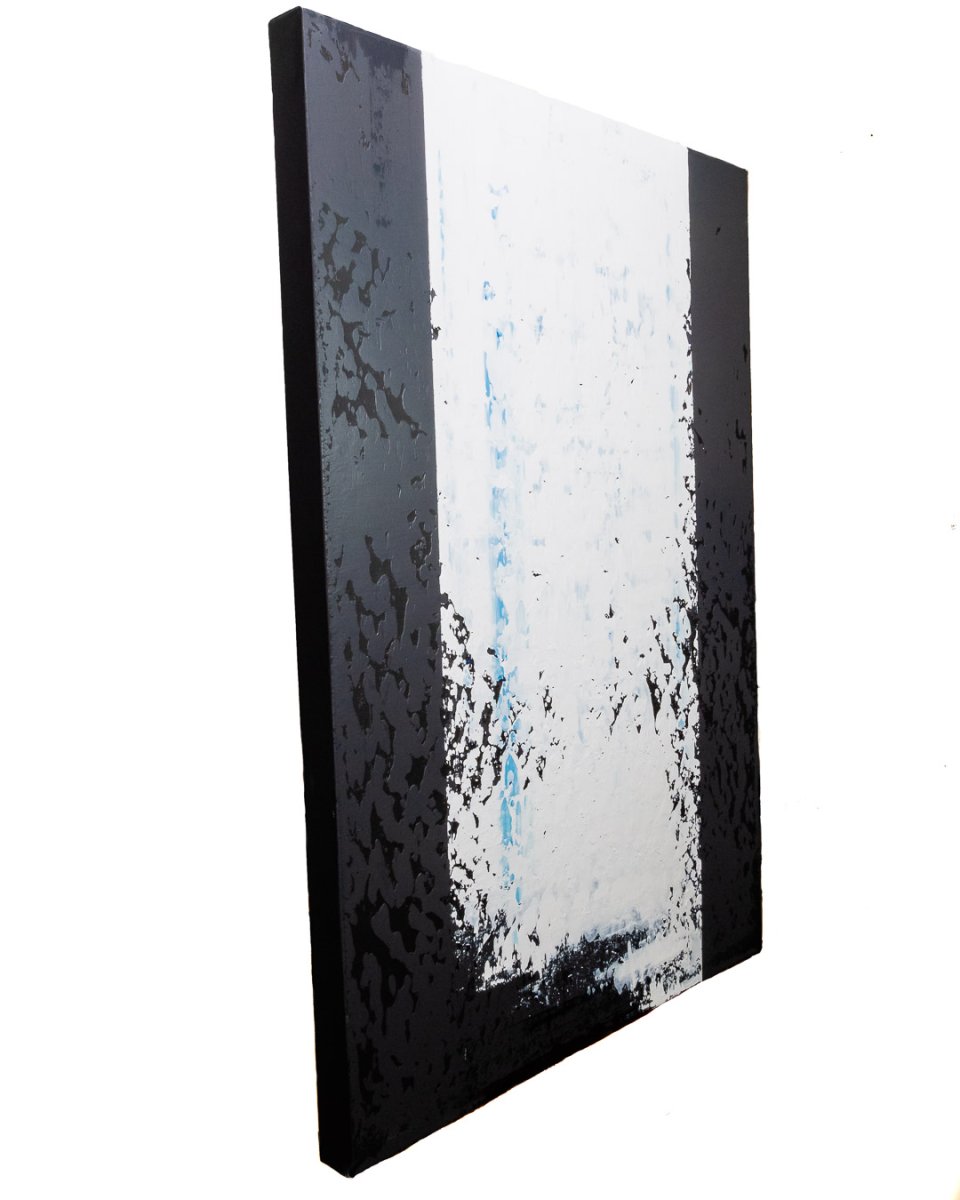 The leading black and white contrasts are reversed – white at the top, black at the bottom – and offset with slight blue accents. The painting is primed in black and the side edges are also black.