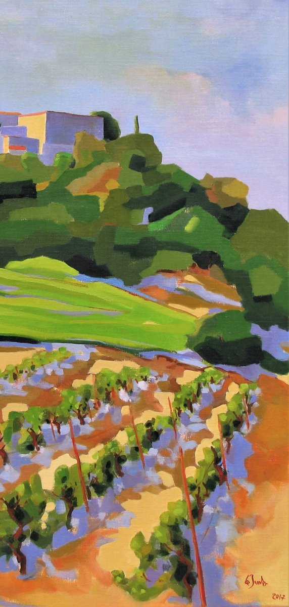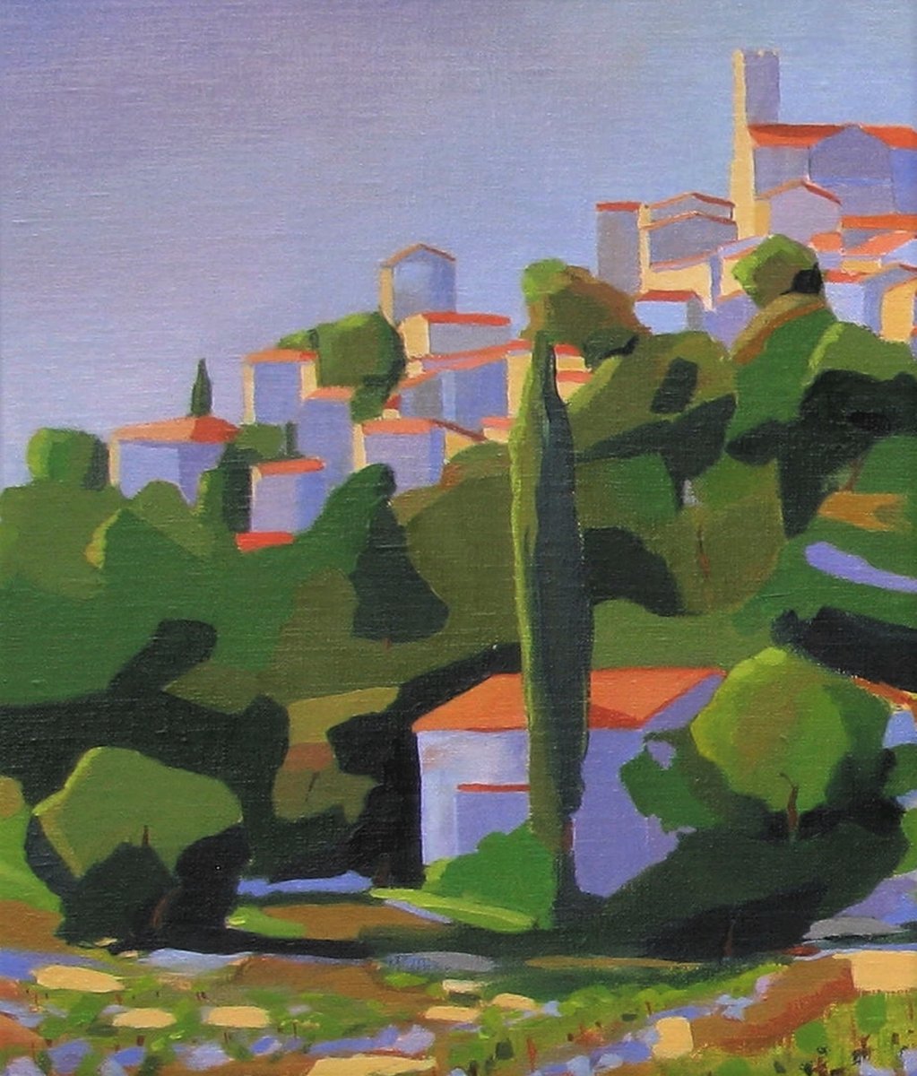 This oil painting depicts the old village of Montferrier sur Lez (Hérault) perched on top of a hill not far from the city of Montpellier. It is a composition based on sketches and watercolors made in three different places. In the upper part is the old village seen from the east, with the church on the left and the castle on the right. An old farmhouse and a vineyard fill the lower half. This oil does not require framing owing to its large size . The sides are painted black. This work is ready to hang.
