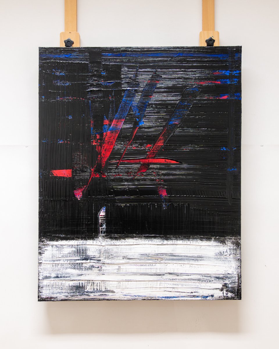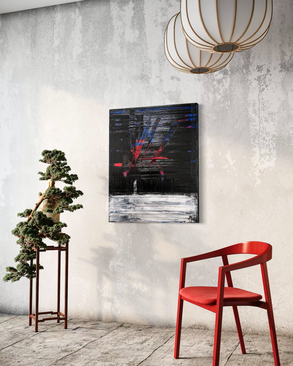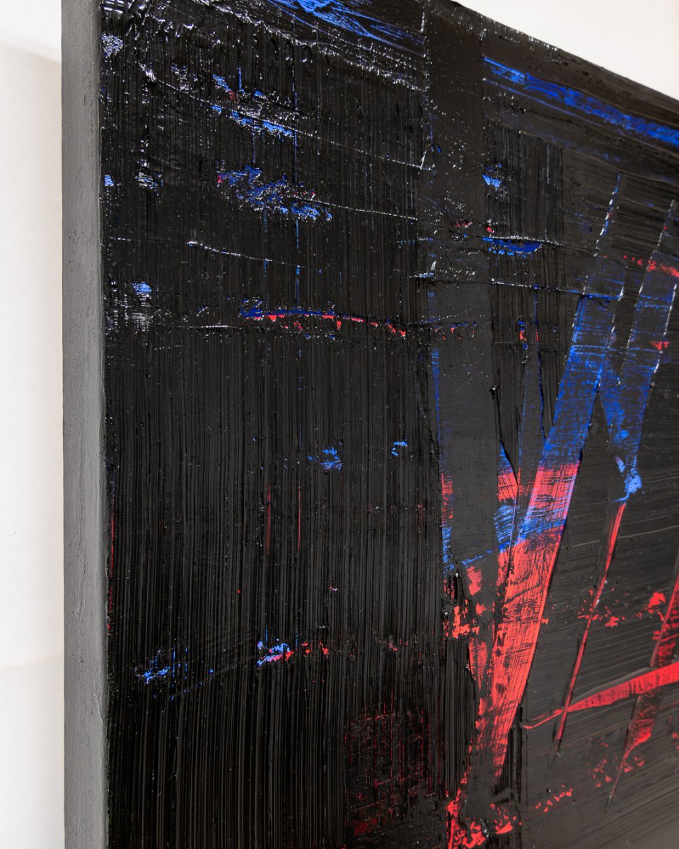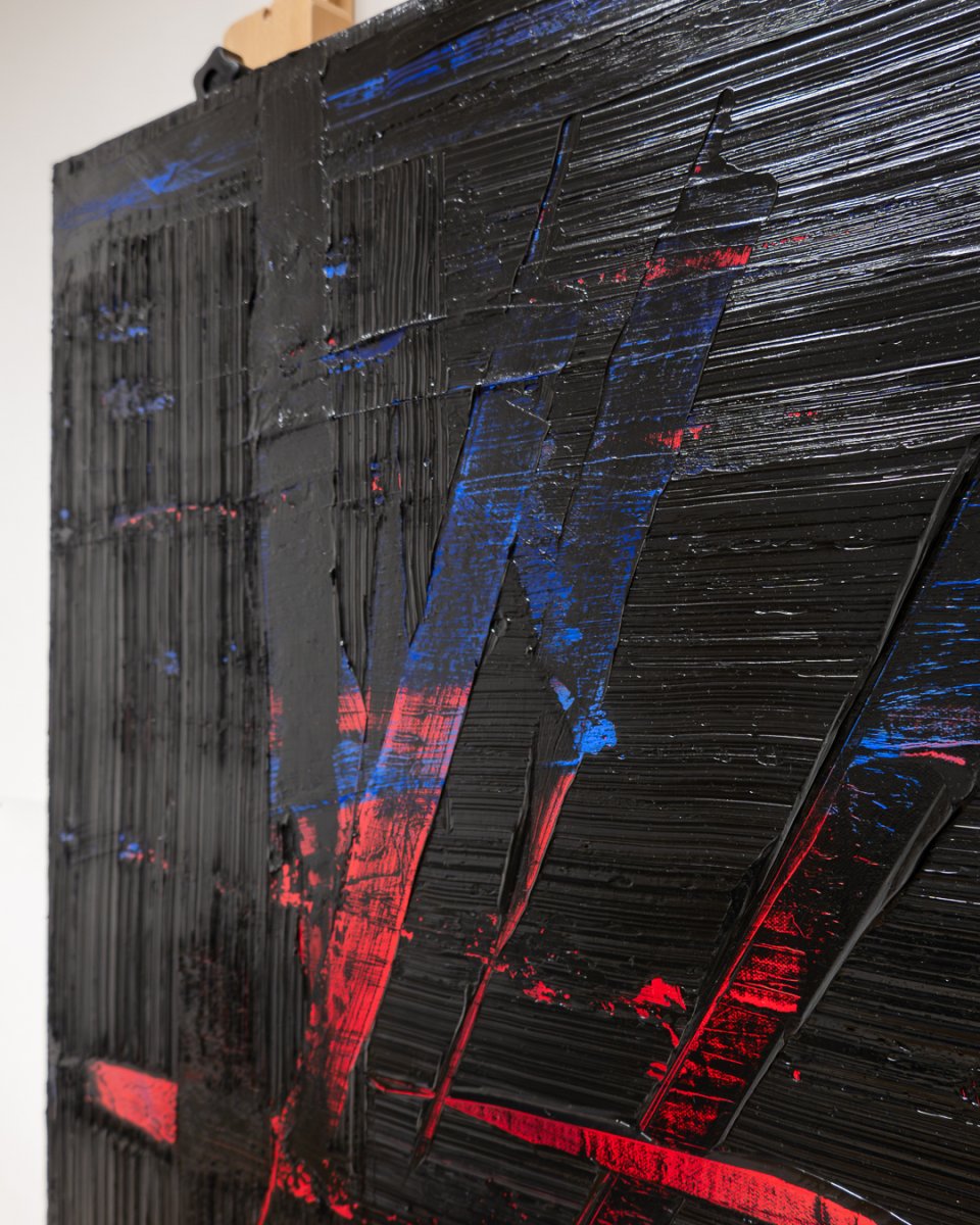 One interpretation: the dominant black surfaces create a dark, almost threatening atmosphere. The glossy black with the texture of grooves, scores and notches reflects the surroundings and their colors depending on the incidence of light and viewing angle. The red and blue accents – the background that reappears by exposing the underlying layers of paint – bring an expressive dynamic into play.