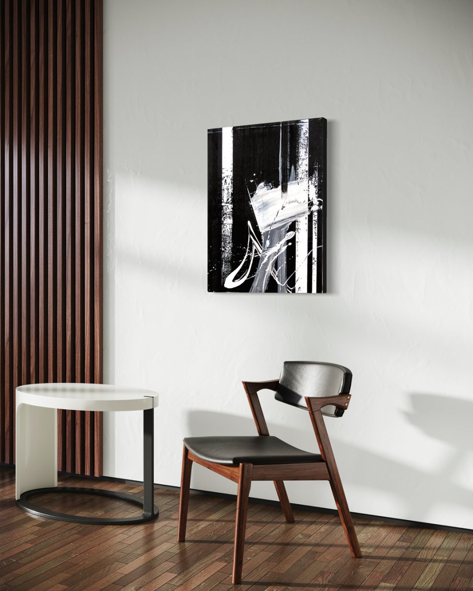 The shadows dance across the canvas, a silent ballet of light and darkness. Every stroke of paint, every line tells a story, whispers of past dreams and unfulfilled desires. The white shapes seem to strive for freedom, while the black embraces and holds them.