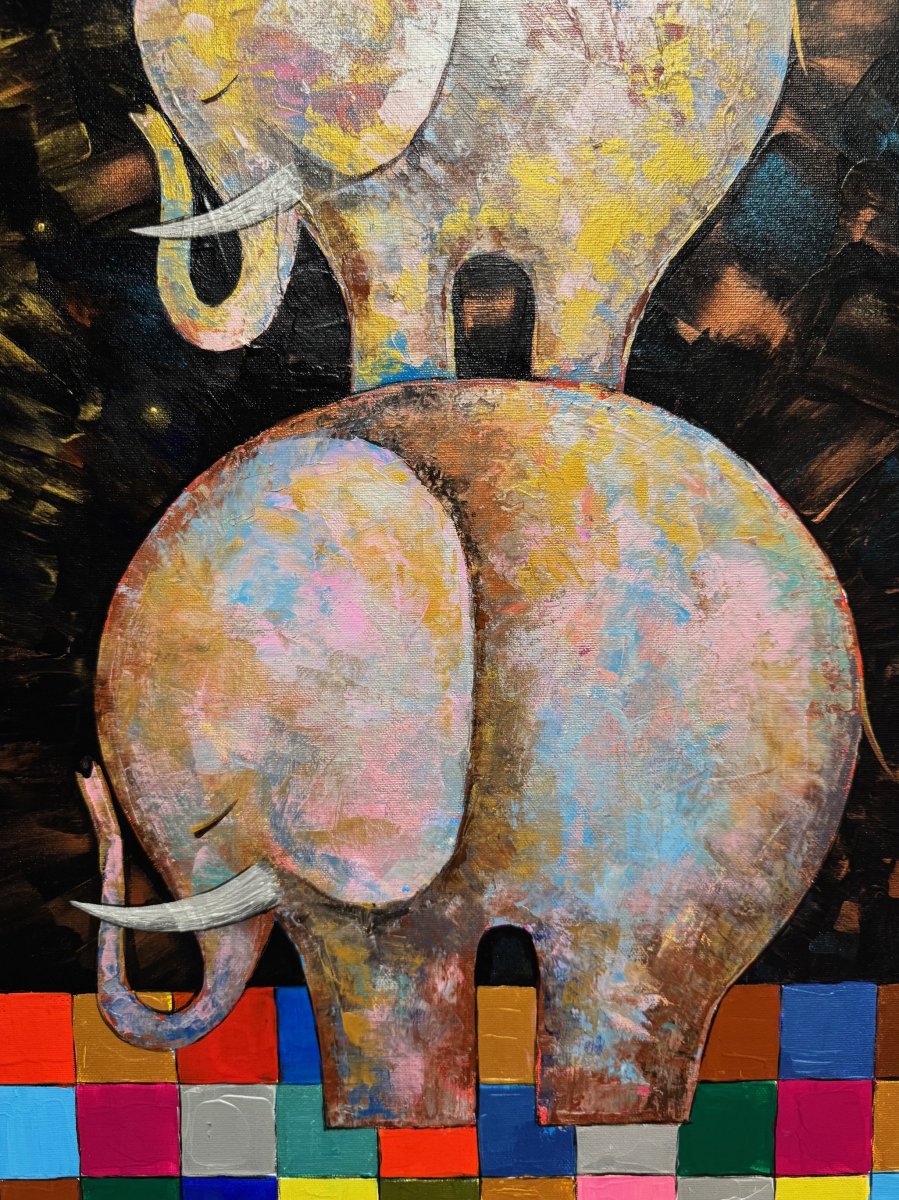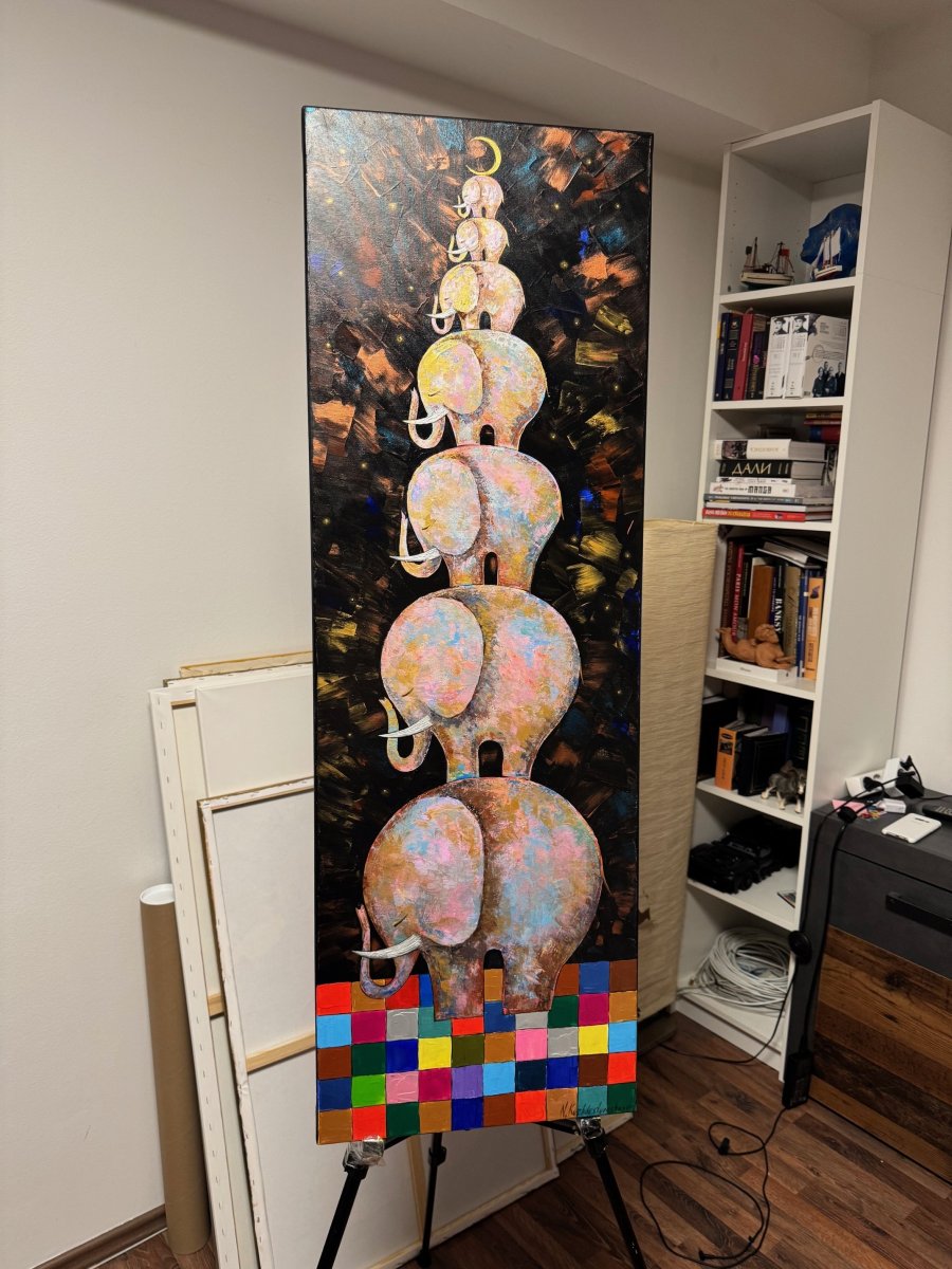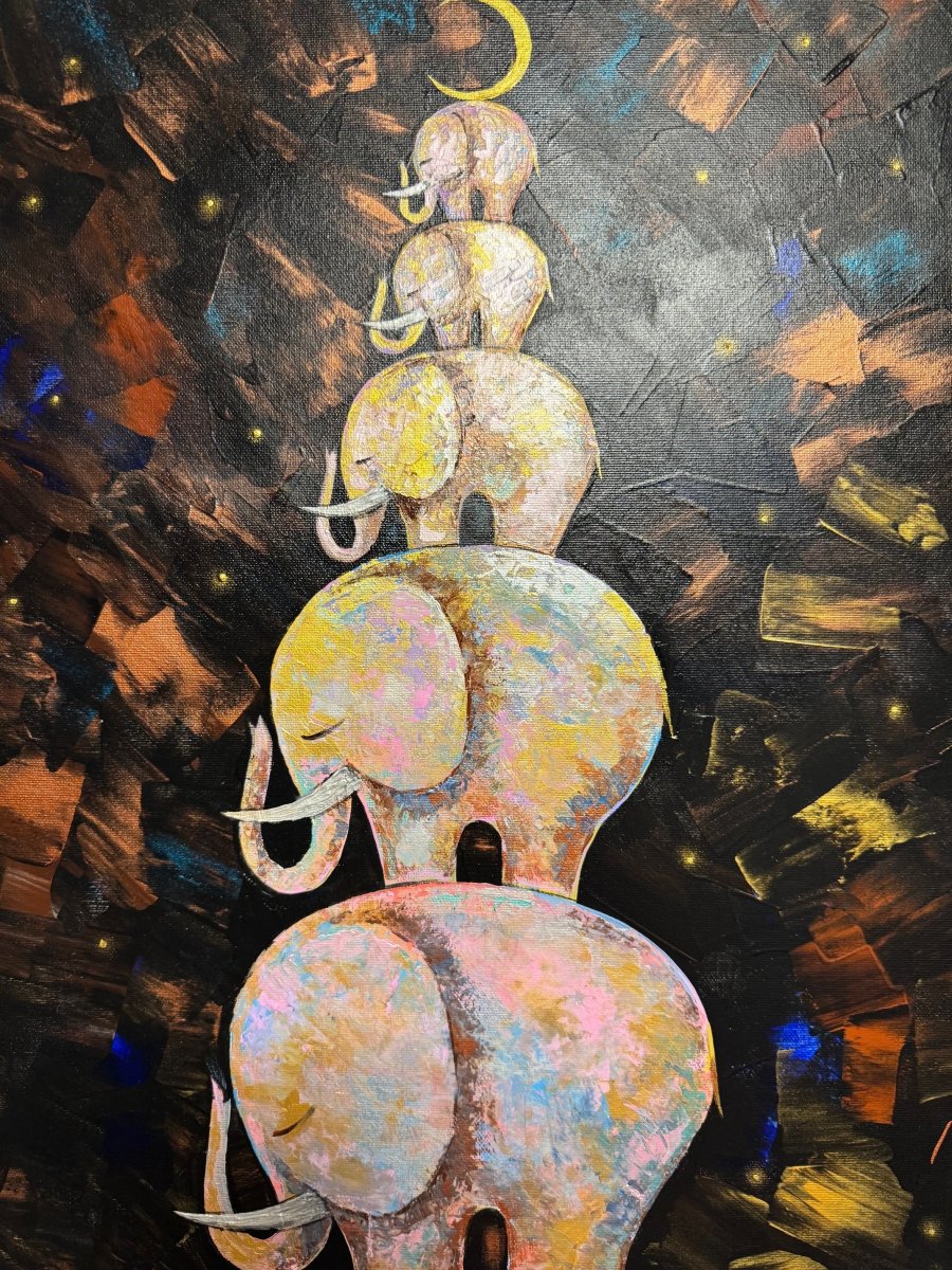 In this work, painted with acrylic paints, figurative art and surrealism intertwine in an impressive way. The elephant family, symbolically stacked on top of each other, shows the strength and cohesion within the family. The mystical backdrop and ambiguous patterns in the foreground stimulate the imagination and give the painting a deeper meaning. This painting is intended to bring inspiration and happiness to every home by emphasizing the magic of connection and the beauty of shared strength.