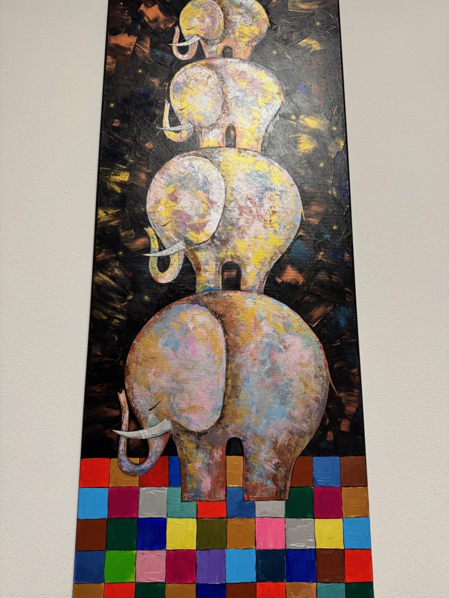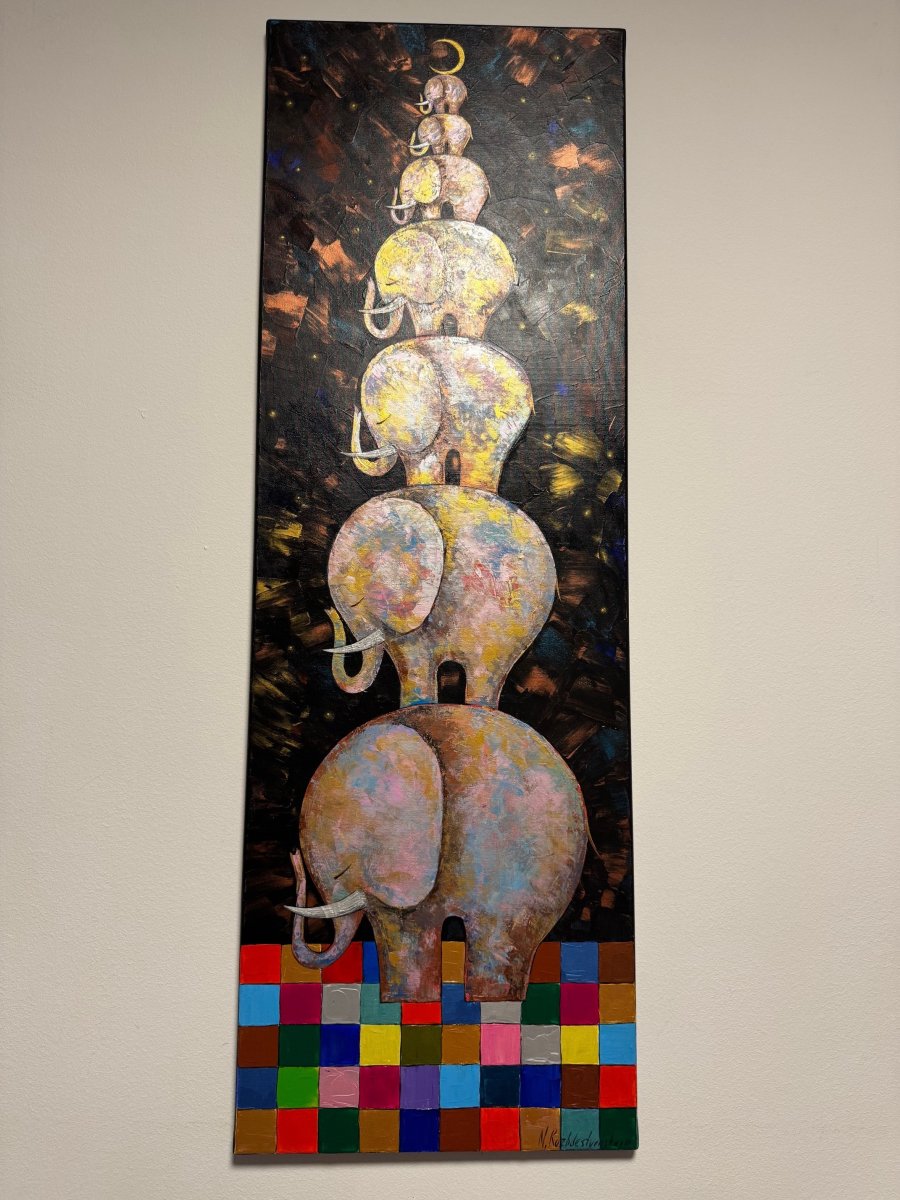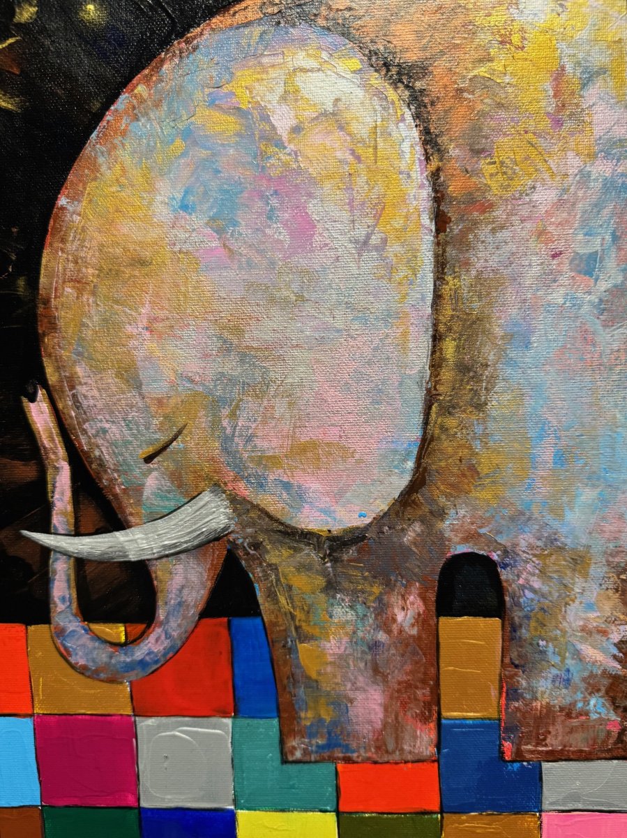 In this work, painted with acrylic paints, figurative art and surrealism intertwine in an impressive way. The elephant family, symbolically stacked on top of each other, shows the strength and cohesion within the family. The mystical backdrop and ambiguous patterns in the foreground stimulate the imagination and give the painting a deeper meaning. This painting is intended to bring inspiration and happiness to every home by emphasizing the magic of connection and the beauty of shared strength.