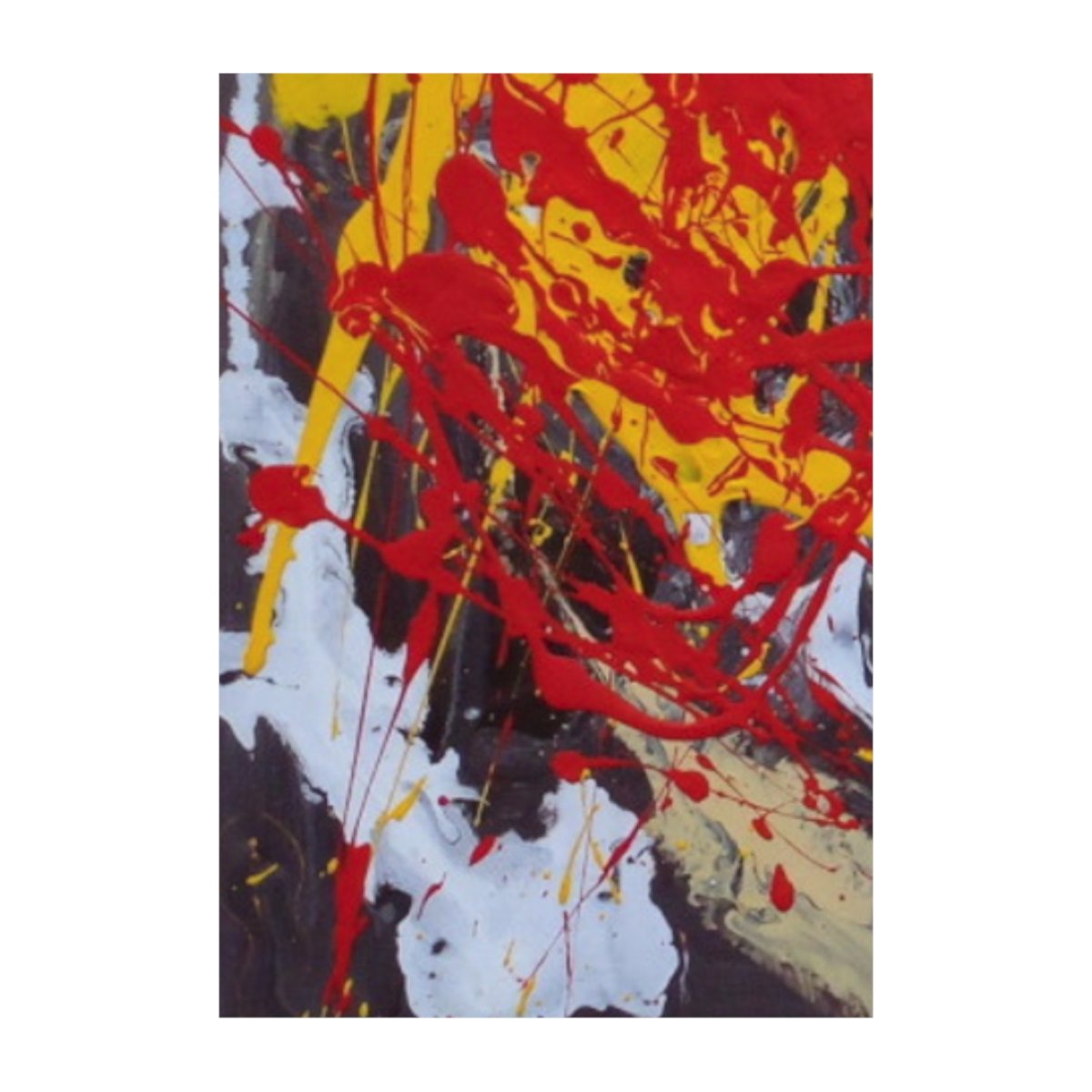 Here, the canvas pulses with a symphony of internal dissonances and harmonies. The chromatic burst of red and yellow on the left is not merely color, but the sonic vibration of an erupting passion, a strident chord breaking free from silence. The white that envelops it is breath, the vital space for this emotional explosion. As my gaze shifts, the central flow of grays and ochres is an inner movement. The fragmented forms and the presence of the text on the right side introduce an element of the concrete, of the word seeking its resonance in the abstract language of shapes and colors, seeking a balance between pure expression and the echo of reason.